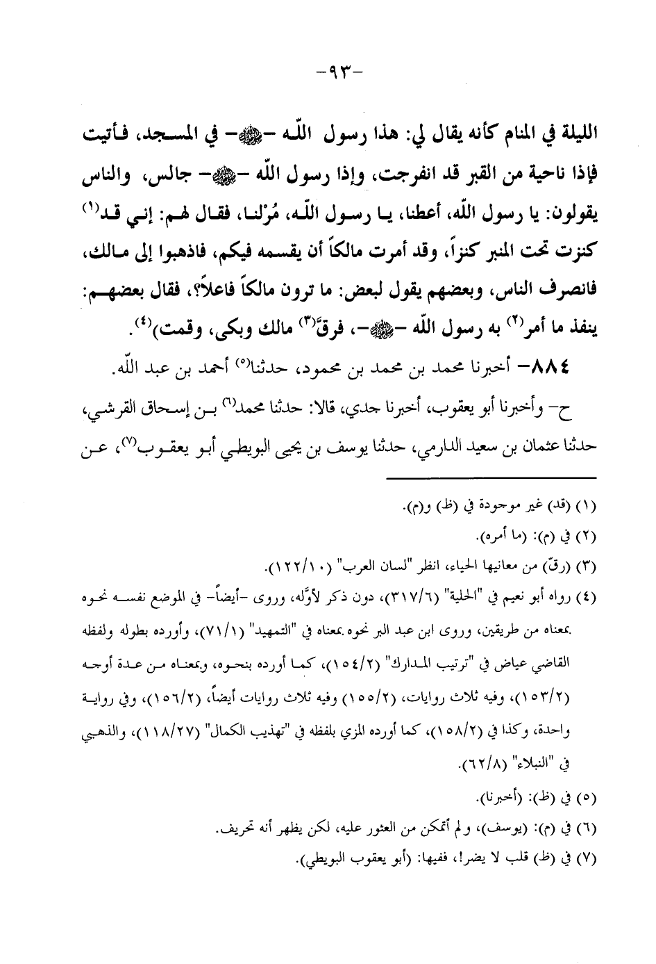 اللَّيْلَةَ فِي الْمَنَامِ كَأَنَّهُ يُقَالُ لِي هَذَا رَسُولُ اللَّهِ صَلَّى اللَّهُ عَلَيْهِ وَسَلَّمَ فِي الْمَسْجِدِ فَأَتَيْتُ فَإِذَا نَاحِيَّةُ مِنَ الْقَبْرِ قَدِ انْفَرَجَتْ وَإِذَا رَسُولُ اللَّهِ صَلَّى اللَّهُ عَلَيْهِ وَسَلَّمَ جَالِسٌ وَالنَّاسُ يَقُولُونَ يَا رَسُولَ اللَّهِ أعطنا يَا رَسُول الله مرلنا فَقَالَ لَهُمْ إِنِّي قَدْ كَنَزْتُ تَحْتَ الْمِنْبَرِ كَنْزًا وَقَدْ أَمَرْتُ مَالِكًا أَنْ يُقَسِّمَهُ فِيكُمْ فَاذْهَبُوا إِلَى مَالِكٍ فَانْصَرَفَ النَّاسُ وَبَعْضُهُمْ يَقُولُ لِبَعْضٍ مَا تَرَوْنَ مَالِكًا فَاعِلًا فَقَالَ بَعْضُهُمْ يُنَفِّذُ مَا أَمَرَ بِهِ رَسُولُ اللَّهِ صَلَّى اللَّهُ عَلَيْهِ وَسَلَّمَ فَرَقَّ مَالِكٌ وَبَكَى وَقُمْتُ)