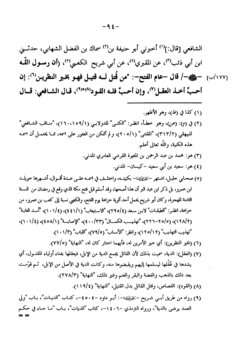 الشَّافِعِيِّ قَالَ أَخْبَرَنِي أَبُو حَنِيفَةَ بْنُ سِمَاكِ بْنِ الْفَضْلِ الشِّهَابِيُّ حَدَّثَنِي ابْنُ أَبِي ذِئْبٍ عَنِ الْمَقْبُرِيِّ عَنْ أَبِي شُرَيْحٍ الْكَعْبِيِّ (أَنَّ رَسُولَ اللَّهِ صَلَّى اللَّهُ عَلَيْهِ وَسَلَّمَ قَالَ عَامَ الْفَتْحِ مَنْ قُتِلَ لَهُ قَتِيلٌ فَهُوَ بِخَيْرِ النَّظَرَيْنِ إِنْ أَحَبَّ أَخَذَ الْعَقْلَ وَإِنْ أَحَبَّ فَلَهُ الْقَوَدُ قَالَ الشَّافِعِيُّ قَالَ