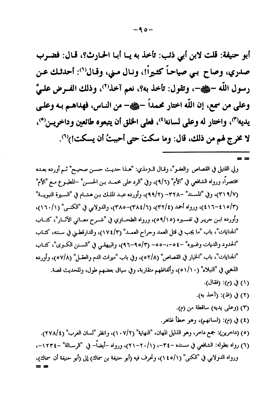 أَبُو حَنِيفَةَ قُلْتُ لِابْنِ أَبِي ذِئْبٍ تَأْخُذُ بِهِ يَا أَبَا الْحَارِثِ قَالَ فَضَرَبَ صَدْرِي وَصَاحَ بِي صِيَاحًا كَثِيرًا وَنَالَ مِنِّي وَقَالَ أُحَدِّثُكَ عَنْ رَسُولِ اللَّهِ صَلَّى اللَّهُ عَلَيْهِ وَسَلَّمَ وَتَقُولُ تَأْخُذُ بِهِ نَعَمْ آخُذُ وَذَلِكَ الْفَرْضُ عَلَيَّ وَعَلَى مَنْ سَمِعَ إِنَّ اللَّهَ اخْتَارَ مُحَمَّدًا صَلَّى اللَّهُ عَلَيْهِ وَسَلَّمَ مِنَ النَّاسِ فهداهم وَعَلَى يَدَيْهِ وَاخْتَارَ لَهُ وَعَلَى لِسَانِهِ فَعَلَى الْخَلْقِ أَنْ يَتَّبِعُوهُ طَائِعِينَ وَدَاخِرِينَ لَا مَخْرَجَ لَهُمْ مِنْ ذَلِكَ قَالَ وَمَا سَكَتَ حَتَّى أَحْبَبْتُ أَنْ يَسْكُتَ)
