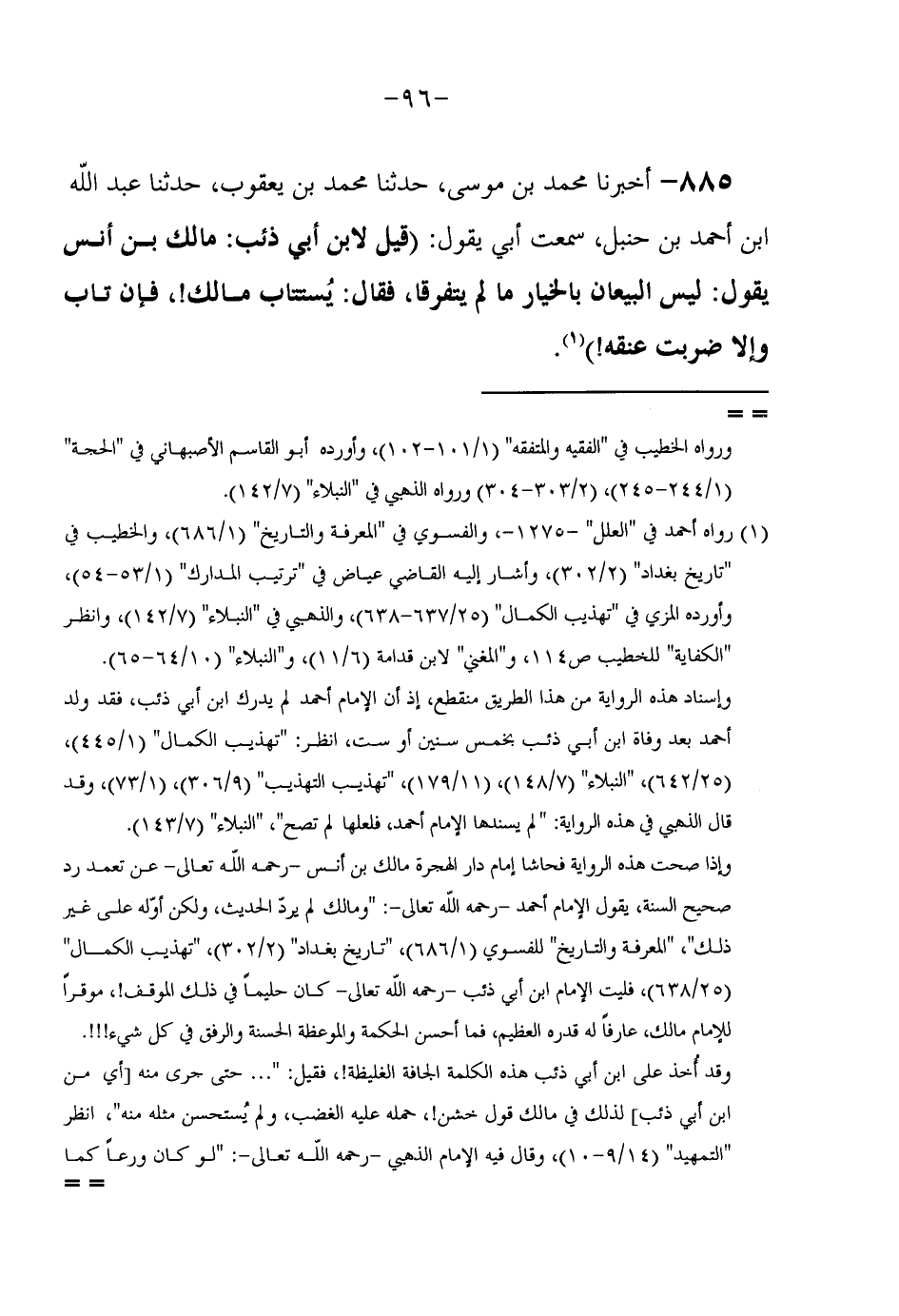885 - أَخْبَرَنَا مُحَمَّدُ بْنُ مُوسَى حَدَّثَنَا مُحَمَّدُ بْنُ يَعْقُوبَ حَدَّثَنَا عَبْدُ الله ابْن أَحْمَدَ بْنِ حَنْبَلٍ سَمِعْتُ أَبِي يَقُولُ (قِيلَ لِابْنِ أَبِي ذِئْبٍ مَالِكُ بْنُ أَنَسٍ يَقُولُ لَيْسَ البيعان بِالْخِيَارِ مالم يَتَفَرَّقَا فَقَالَ يُسْتَتَابُ مَالِكٌ فَإِنْ تَابَ وَإِلَّا ضَرَبْتُ عُنُقَهُ)