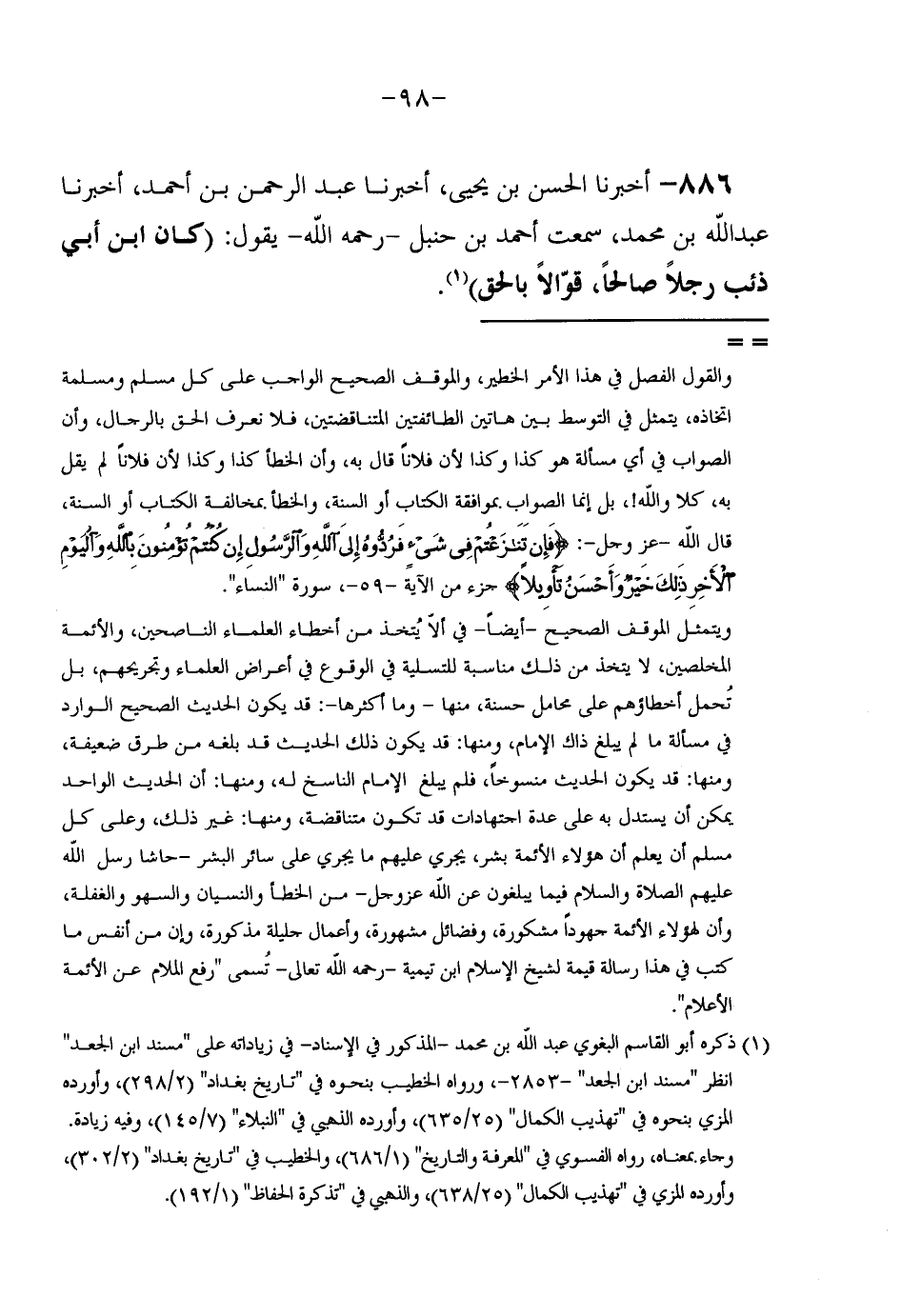 886 - أَخْبَرَنَا الْحَسَنُ بْنُ يَحْيَى أَخْبَرَنَا عَبْدُ الرَّحْمَنِ بْنُ أَحْمَدَ أَخْبَرَنَا عَبْدُ اللَّهِ بْنُ مُحَمَّدٍ سَمِعْتُ أَحْمَدُ بْنُ حَنْبَلٍ رَحِمَهُ اللَّهُ يَقُولُ (كَانَ ابْنُ أَبِي ذِئْبٍ رَجُلًا صَالِحًا قَوَّالًا بِالْحَقِّ)