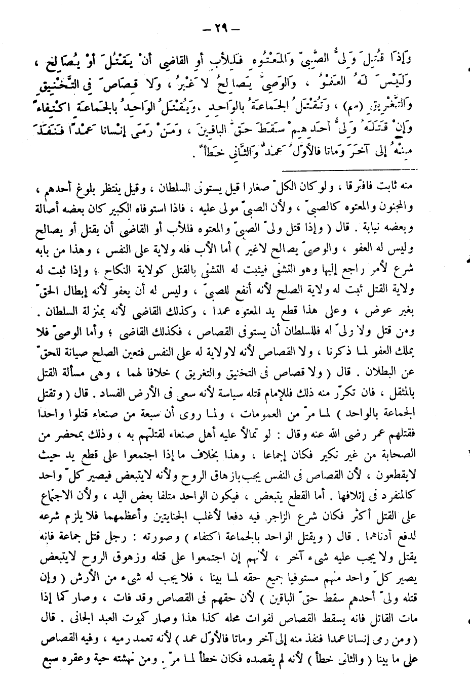 وَإِذَا قُتِلَ وَلِيُّ الصَّبِيِّ وَالْمَعْتُوهِ فَلِلْأَبِ أَوِ الْقَاضِي أَنْ يَقْتُلَ أَوْ يُصَالِحَ، وَلَيْسَ لَهُ الْعَفْوُ، وَالْوَصِيُّ يُصَالِحُ لَا غَيْرَ، وَلَا قِصَاصَ فِي التَّخْنِيقِ وَالتَّغْرِيقِ (سم) ، وَتُقْتَلُ الْجَمَاعَةُ بِالْوَاحِدِ، وَيُقْتَلُ الْوَاحِدُ بِالْجَمَاعَةِ اكْتِفَاءً وَإِنْ قَتَلَهُ وَلِيُّ أَحَدِهِمْ سَقَطَ حَقُّ الْبَاقِينَ، وَمَنْ رَمَى إِنْسَانًا عَمْدًا فَنَفَذَ مِنْهُ إِلَى آخَرَ وَمَاتَا فَالْأَوَّلُ عَمْدٌ وَالثَّانِي خَطَأٌ.