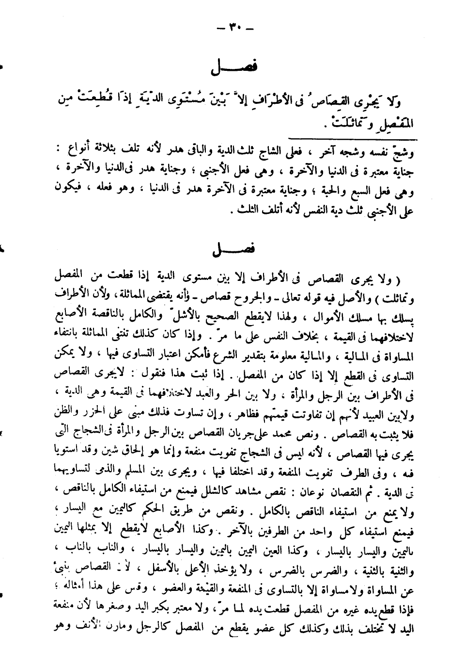 فَصْلٌ وَلَا يَجْرِي الْقِصَاصُ فِي الْأَطْرَافِ إِلَّا بَيْنَ مُسْتَوِي الدِّيَةِ إِذَا قُطِعَتْ مِنَ الْمَفْصِلِ وَتَمَاثَلَتْ،