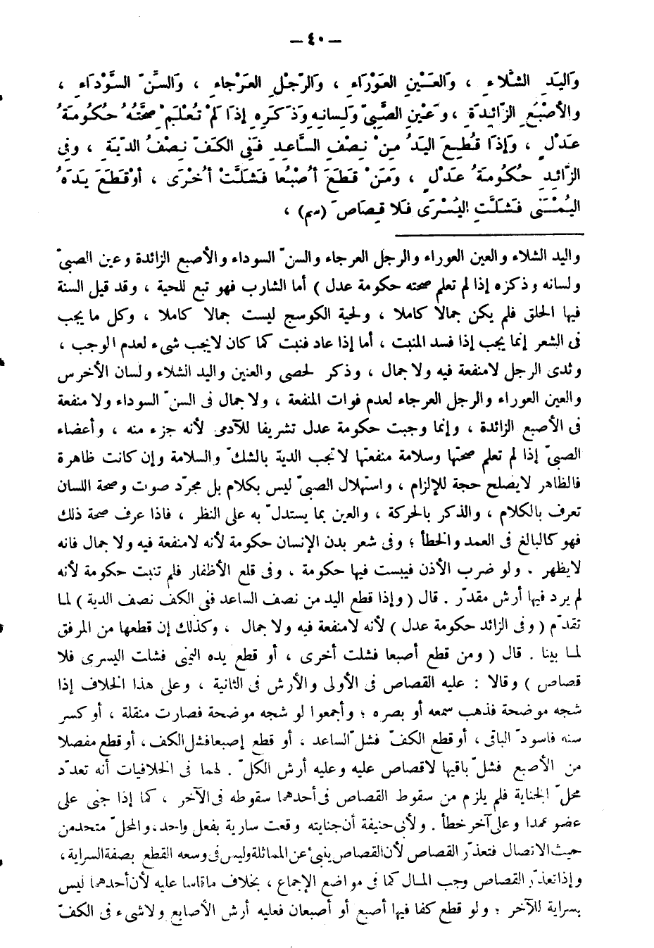ـــــــــــــــــــــــــــــQوَالْيَدِ الشَّلَّاءِ وَالْعَيْنِ الْعَوْرَاءِ وَالرِّجْلِ الْعَرْجَاءِ وَالسِّنِّ السَّوْدَاءِ وَالْأُصْبُعِ الزَّائِدَةِ وَعَيْنِ الصَّبِيِّ وَلِسَانِهِ وَذَكَرهِ إِذَا لَمْ تُعْلَمْ صِحَّتُهُ حُكُومَةُ عَدْلٍ) ، أَمَّا الشَّارِبُ فَهُوَ تَبَعٌ لِلِّحْيَةِ، وَقَدْ قِيلَ: السُّنَّةُ فِيهَا الْحَلْقُ فَلَمْ يَكُنْ جَمَالًا كَامِلًا، وَلِحْيَةُ الْكَوْسَجِ لَيْسَتْ جَمَالًا كَامِلًا، وَكُلُّ مَا يَجِبُ فِي الشَّعْرِ إِنَّمَا يَجِبُ إِذَا فَسَدَ الْمَنْبَتُ، أَمَّا إِذَا عَادَ فَنَبَتَ كَمَا كَانَ لَا يَجِبُ شَيْءٌ لِعَدَمِ الْوَجْبِ، وَثَدْيُ الرَّجُلِ لَا مَنْفَعَةَ فِيهِ وَلَا جَمَالَ، وَذَكَرُ الْخَصِيِّ وَالْعِنِّينِ وَالْيَدُ الشَّلَّاءُ وَلِسَانُ الْأَخْرَسِ وَالْعَيْنُ الْعَوْرَاءُ وَالرِّجْلُ الْعَرْجَاءُ لِعَدَمِ فَوَاتِ الْمَنْفَعَةِ، وَلَا جَمَالِ فِي السِّنِّ السَّوْدَاءِ وَلَا مَنْفَعَةَ فِي الْأُصْبُعِ الزَّائِدَةِ، وَإِنَّمَا وَجَبَتْ حُكُومَةُ عَدْلٍ تَشْرِيفًا لِلْآدَمِيِّ؛ لِأَنَّهُ جُزْءٌ مِنْهُ، وَأَعْضَاءُ الصَّبِيِّ إِذَا لَمْ تُعْلَمْ صِحَّتُهَا وَسَلَامَةُ مَنْفَعَتِهَا لَا تَجِبُ الدِّيَةُ بِالشَّكِّ وَالسَّلَامَةِ وَإِنْ كَانَتْ ظَاهِرَةً فَالظَّاهِرُ لَا يَصْلُحُ حُجَّةً لِلْإِلْزَامِ، وَاسْتِهْلَالُ الصَّبِيِّ لَيْسَ بِكَلَامٍ بَلْ مُجَرَّدُ صَوْتٍ وَصِحَّةُ اللِّسَانِ تُعْرَفُ بِالْكَلَامِ، وَالذَّكَرُ بِالْحَرَكَةِ، وَالْعَيْنُ بِمَا يُسْتَدَلُّ بِهِ عَلَى النَّظَرِ، فَإِذَا عُرِفَ صِحَّةُ ذَلِكَ فَهُوَ كَالْبَالِغِ فِي الْعَمْدِ وَالْخَطَأِ، وَفِي شَعْرِ بَدَنِ الْإِنْسَانِ حُكُومَةٌ لِأَنَّهُ لَا مَنْفَعَةَ فِيهِ وَلَا جَمَالَ فَإِنَّهُ لَا يَظْهَرُ.