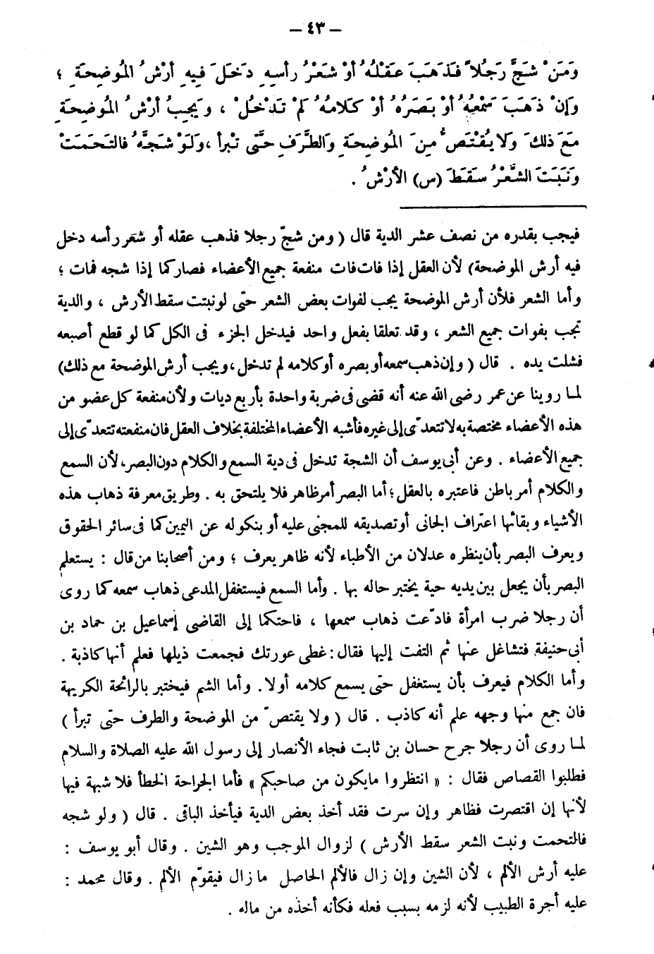 وَمَنْ شَجَّ رَجُلًا فَذَهَبَ عَقْلُهُ أَوْ شَعْرُ رَأْسِهِ دَخَلَ فِيهِ أَرْشُ الْمُوضِحَةِ، وَإِنْ ذَهَبَ سَمْعُهُ أَوْ بَصَرُهُ أَوْ كَلَامُهُ لَمْ تَدْخُلْ، وَيَجِبُ أَرْشُ الْمُوضِحَةِ مَعَ ذَلِكَ وَلَا يُقْتَصُّ مِنَ الْمُوضِحَةِ وَالطَّرَفِ حَتَّى تَبْرَأَ، وَلَوْ شَجَّهُ فَالْتَحَمَتْ وَنَبَتَ الشَعْرُ سَقَطَ (س) الْأَرْشُ.