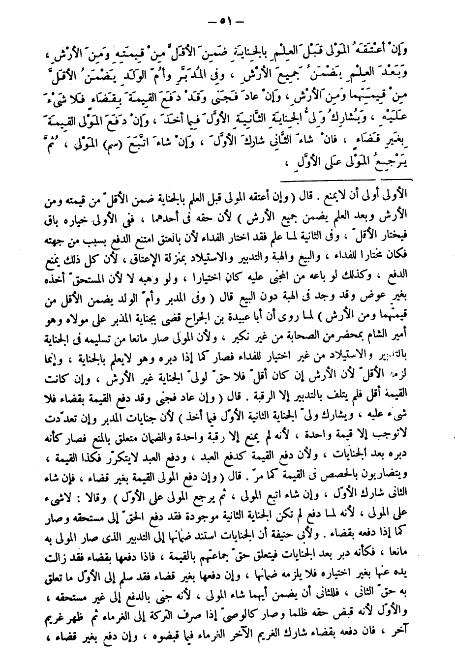 قَالَ: (وَفِي الْمُدَبَّرِ وَأُمِّ الْوَلَدِ يَضْمَنُ الْأَقَلَّ مِنْ قِيمَتِهِمَا وَمِنَ الْأَرْشِ) لِمَا رُوِيَ أَنَّ أَبَا عُبَيْدَةَ بْنَ الْجَرَّاحِ قَضَى بِجِنَايَةِ الْمُدَبَّرِ عَلَى مَوْلَاهُ وَهُوَ أَمِيرُ الشَّامِ بِمَحْضَرٍ مِنَ الصَّحَابَةِ مِنْ غَيْرِ نَكِيرٍ، وَلِأَنَّ الْمَوْلَى صَارَ مَانِعًا مِنْ تَسْلِيمِهِ فِي الْجِنَايَةِ بِالتَّدْبِيرِ وَالِاسْتِيلَادِ مِنْ غَيْرِ اخْتِيَارٍ لِلْفِدَاءِ فَصَارَ كَمَا إِذَا دَبَّرَهُ وَهُوَ لَا يَعْلَمُ بِالْجِنَايَةِ، وَإِنَّمَا لَزِمَهُ الْأَقَلُّ؛ لِأَنَّ الْأَرْشَ إِنْ كَانَ أَقَلَّ فَلَا حَقَّ لِوَلِيِّ الْجِنَايَةِ غَيْرَ الْأَرْشِ، وَإِنْ كَانَتِ الْقِيمَةُ أَقَلَّ فَلَمْ يَتْلَفْ بِالتَّدْبِيرِ إِلَّا الرَّقَبَةُ.