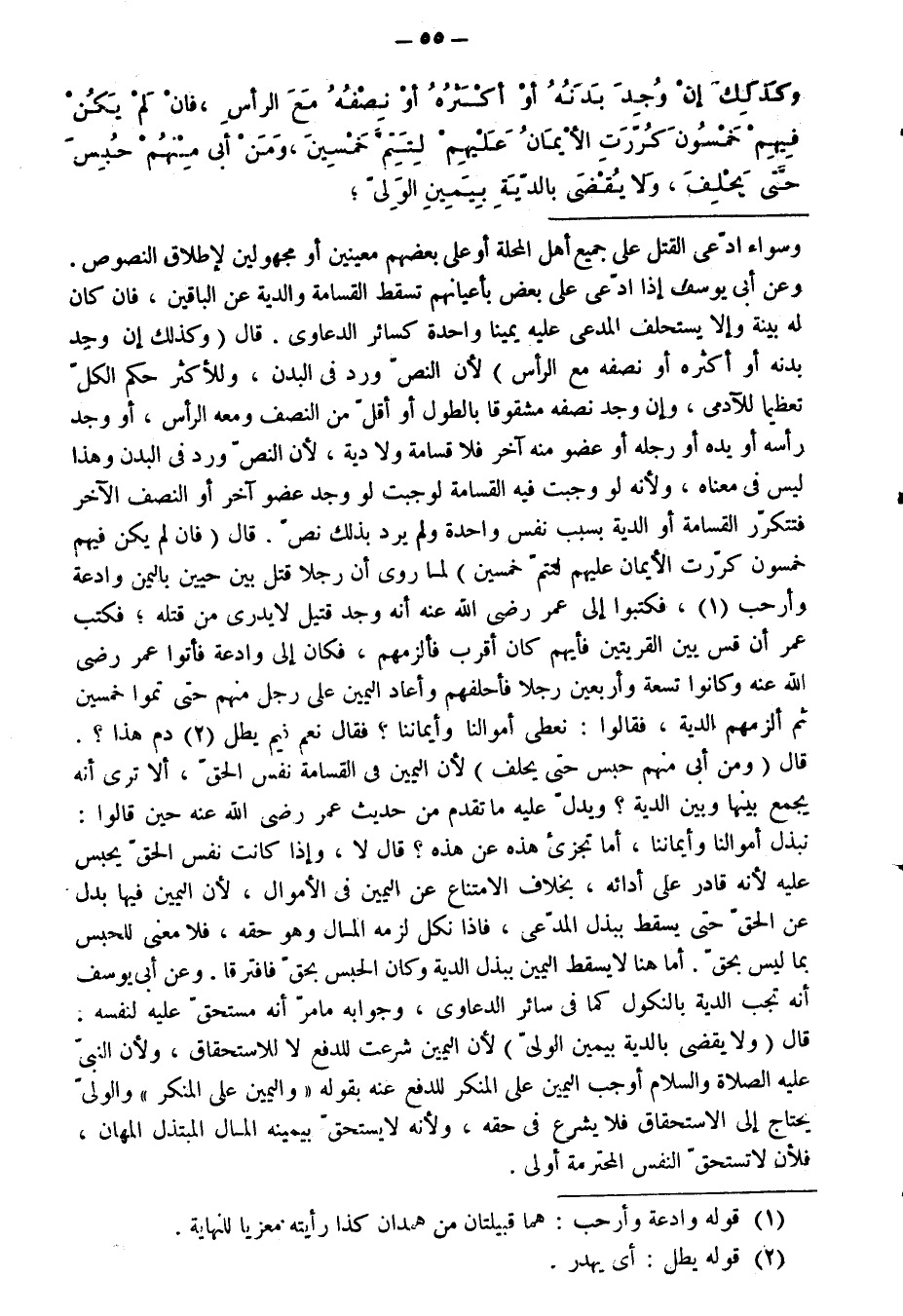 قَالَ: (فَإِنْ لَمْ يَكُنْ فِيهِمْ خَمْسُونَ كُرِّرَتِ الْأَيْمَانُ عَلَيْهِمْ لِتَتِمَّ خَمْسِينَ) لِمَا رُوِيَ أَنَّ رَجُلًا قُتِلَ بَيْنَ حَيَّيْنِ بِالْيَمَنِ وَادِعَةَ وَأَرْحَبَ، فَكَتَبُوا إِلَى عُمَرَ - رَضِيَ اللَّهُ عَنْهُ - أَنَّهُ وُجِدَ قَتِيلٌ لَا يُدْرَى مَنْ قَتَلَهُ، فَكَتَبَ عُمَرُ أَنْ قِسْ بَيْنَ الْقَرْيَتَيْنِ فَأَيُّهُمْ كَانَ أَقْرَبَ فَأَلْزِمْهُمْ، فَكَانَ إِلَى وَادِعَةَ فَأَتَوْا عُمَرَ - رَضِيَ اللَّهُ عَنْهُ - وَكَانُوا تِسْعَةً وَأَرْبَعِينَ رَجُلًا فَأَحْلَفَهُمْ وَأَعَادَ الْيَمِينَ عَلَى رَجُلٍ مِنْهُمْ حَتَّى تَمُّوا خَمْسِينَ ثُمَّ أَلْزَمَهُمُ الدِّيَةَ، فَقَالُوا: نُعْطِي أَمْوَالَنَا وَأَيْمَانَنَا؟ فَقَالَ: نَعَمْ فِيمَ يُطَلُّ دَمُ هَذَا؟