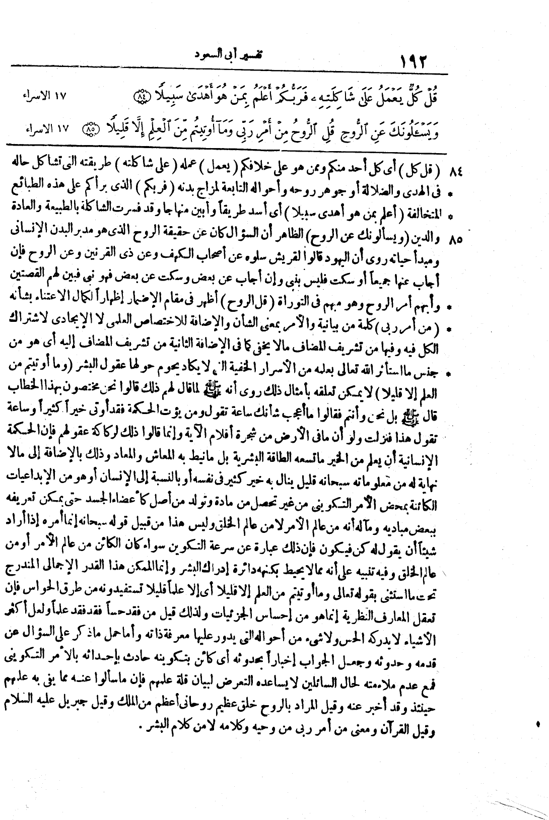84 - 85 84 (قُلْ كُلٌّ) أي كلُّ أحدٍ منكم وممن هو على خلافكم (يَعْمَلُ) عمله (على شَاكِلَتِهِ) طريقتِه التي تشاكل حالَه في الهدى والضلال أو جوهرِ روحِه وأحوالِه التابعة لمزاج بدنه (قربكم) الذي برأكم على هذه الطبائِع المتخالفة (أَعْلَمُ بِمَنْ هُوَ أهدى سَبِيلاً) أي أسدُّ طريقاً وأبينُ مِنهاجاً وقد فُسِّرت الشاكلةُ بالطبيعة والعادة والدين