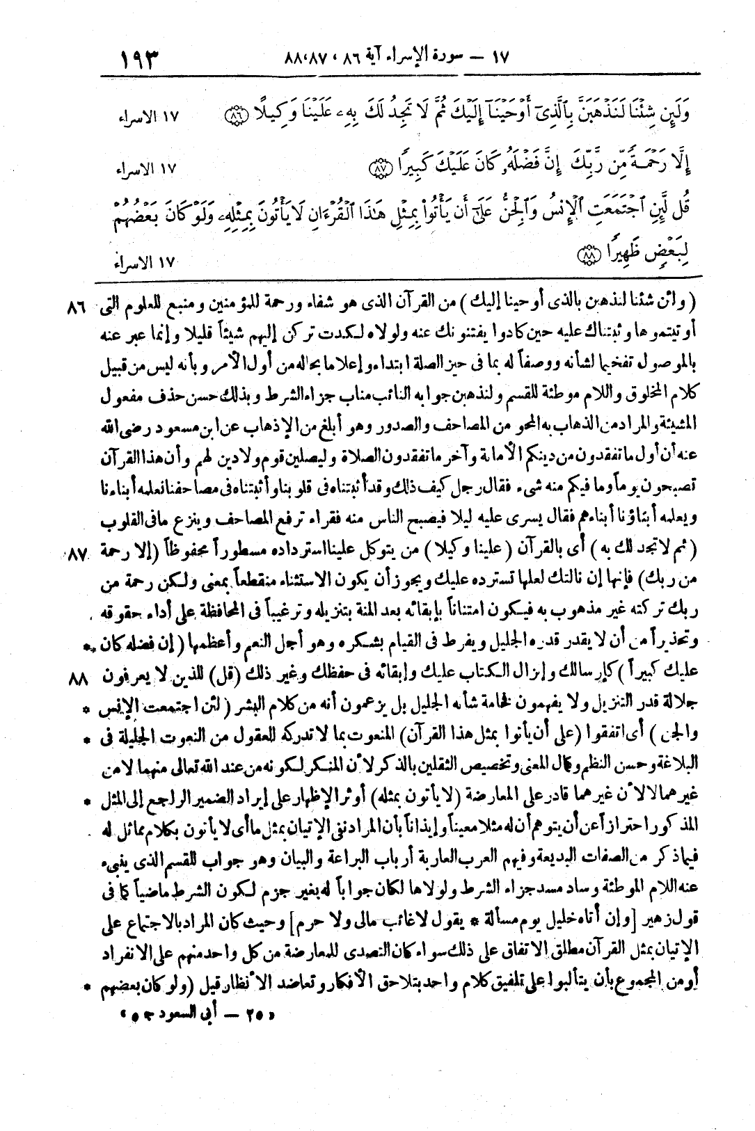 86 - 8 {وَلَئِن شِئْنَا لَنَذْهَبَنَّ بالذى أَوْحَيْنَا إِلَيْكَ) من القرآن الذي هو شفاءٌ ورحمةٌ للمؤمنين ومنبَعٌ للعلوم التي أوتيتموها وثبتّناك عليه حين كادوا يفتنونك عنه ولولاه لكدتَ تركن إليهم شيئا قليلا وإنما عبّر عنه بالموصول تفخيماً لشأنه ووصفاً له بما في حيز الصلة ابتداءً وإعلاماً بحاله من أول الأمرِ وبأنه ليس من قبيل كلامِ المخلوقِ واللامُ موطئةٌ للقسم ولنذهبن جوابُه النائبُ منابَ جزاءِ الشرطِ وبذلك حسُنَ حذفُ مفعولِ المشيئةِ والمرادُ من الذهاب به المحوُ من المصاحف والصدورِ وهو أبلغُ من الإذهاب عنِ ابنِ مسعودٍ رضيَ الله عنه أن أولَ ما تفقِدون من دينكم الأمانةُ وآخرَ ما تفقِدون الصلاةُ وليُصَلّين قوم ولادين لهم وأن هذا القرآنَ تُصبحون يوماً وما فيكم منه شيءٌ فقال رجلٌ كيف ذلك وقد أثبتناه في قلوبنا وأثبتْناه في مصاحفنا نعلّمه أبناءَنا ويعلمه أبناؤُنا أبناءَهم فقال يسرى عليه ليلاً فيصبح الناسُ منه فقراءَ تُرفع المصاحفُ وينزَعُ ما في القلوب (ثُمَّ لاَ تَجِدُ لَكَ به) أي القران (عَلَيْنَا وَكِيلاً) من يتوكل علينا استردادَه مسطوراً محفوظاً