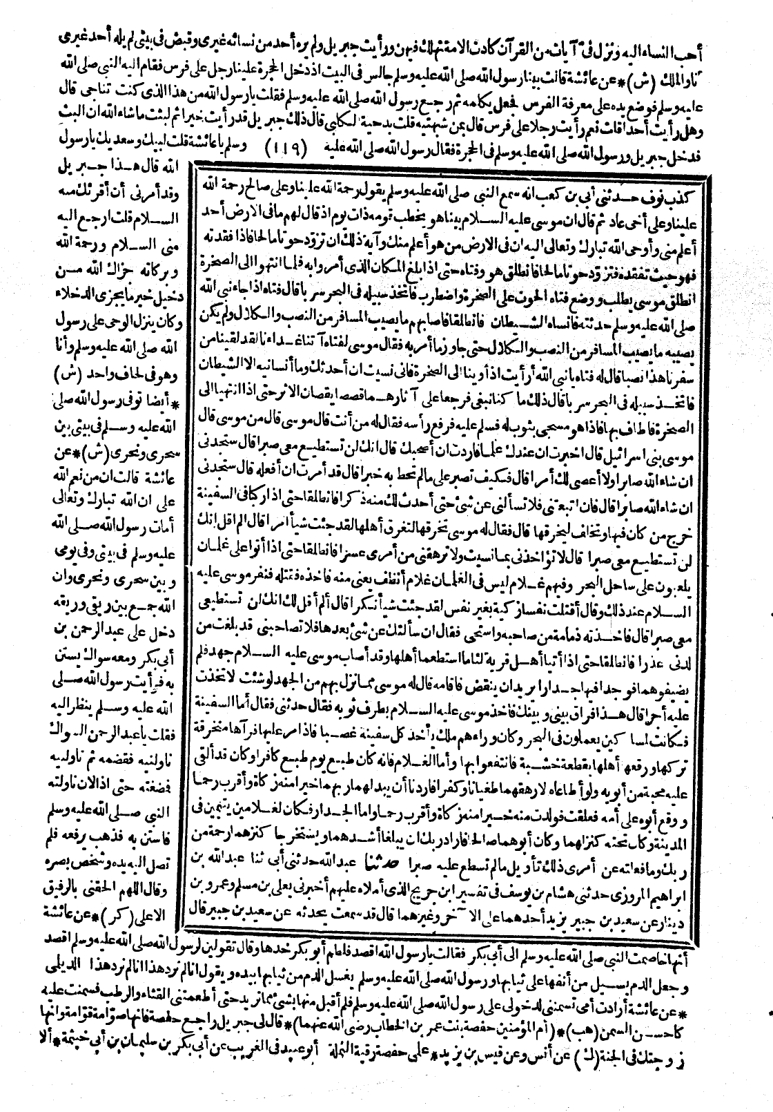حَدَّثَنِي أُبَيُّ بْنُ كَعْبٍ : أَنَّهُ سَمِعَ النَّبِيَّ صَلَّى اللَّهُ عَلَيْهِ وَسَلَّمَ يَقُولُ : رَحْمَةُ اللهِ عَلَيْنَا وَعَلَى صَالِحٍ رَحْمَةُ اللهِ عَلَيْنَا وَعَلَى أَخِي عَادٍ ، ثُمَّ قَالَ : إِنَّ مُوسَى بَيْنَا هُوَ يَخْطُبُ قَوْمَهُ ذَاتَ يَوْمٍ ، إِذْ قَالَ لَهُمْ : مَا فِي الأَرْضِ أَحَدٌ أَعْلَمُ مِنِّي ، وَأَوْحَى اللَّهُ إِلَيْهِ : إِنَّ فِي الأَرْضِ مَنْ هُوَ أَعْلَمُ مِنْكَ ، وَآيَةُ ذَلِكَ أَنْ تُزَوَّدَ حُوتًا مَالِحًا ، فَإِذَا فَقَدْتَهُ ، فَهُوَ حَيْثُ تَفْقِدُهُ ، فَتَزَوَّدَ حُوتًا مَالِحًا ، فَانْطَلَقَ هُوَ وَفَتَاهُ ، حَتَّى إِذَا بَلَغَ الْمَكَانَ الَّذِي أُمِرُوا بِهِ ، فَلَمَّا انْتَهَوْا إِلَى الصَّخْرَةِ ، انْطَلَقَ مُوسَى يَطْلُبُ ، وَوَضَعَ فَتَاهُ الْحُوتَ عَلَى الصَّخْرَةِ ، وَاضْطَرَبَ ، {فَاتَّخَذَ سَبِيلَهُ فِي الْبَحْرِ سَرَبًا} ، قَالَ فَتَاهُ : إِذَا جَاءَ نَبِيُّ اللهِ حَدَّثْتُهُ ، {فَأَنْسَاهُ الشَّيْطَانُ} ، فَانْطَلَقَا ، فَأَصَابَهُمْ مَا يُصِيبُ الْمُسَافِرَ مِنَ النَّصَبِ ، وَالْكَلاَلِ ، وَلَمْ يَكُنْ يُصِيبُهُ مَا يُصِيبُ الْمُسَافِرَ مِنَ النَّصَبِ ، وَالْكَلاَلِ حَتَّى جَاوَزَ مَا أُمِرَ بِهِ ، فَقَالَ مُوسَى لِفَتَاهُ : {آتِنَا غَدَاءَنَا لَقَدْ لَقِينَا مِنْ سَفَرِنَا هَذَا نَصَبًا} قَالَ لَهُ فَتَاهُ : يَا نَبِيَّ اللهِ ، {أَرَأَيْتَ إِذْ أَوَيْنَا إِلَى الصَّخْرَةِ فَإِنِّي نَسِيتُ} أَنْ أُحَدِّثَكَ {وَمَا أَنْسَانِيهُ إِلاَّ الشَّيْطَانُ} {فَاتَّخَذَ سَبِيلَهُ فِي الْبَحْرِ سَرَبًا} ، قَالَ : {ذَلِكَ مَا كُنَّا نَبْغِ} فَرَجَعَا عَلَى آثَارِهِمَا قَصَصًا ، يَقُصَّانِ الأَثَرَ حَتَّى إِذَا انْتَهَيَا إِلَى الصَّخْرَةِ ، فَأَطَافَ بِهَا ، فَإِذَا هُوَ مُسَجًّى بِثَوْبٍ لَهُ ، فَسَلَّمَ عَلَيْهِ فَرَفَعَ رَأْسَهُ ، فَقَالَ لَهُ : مَنْ أَنْتَ ؟ قَالَ : مُوسَى ، قَالَ : مَنْ مُوسَى ؟ قَالَ : مُوسَى بَنِي إِسْرَائِيلَ ، قَالَ : أُخْبِرْتُ أَنَّ عِنْدَكَ عِلْمًا ، فَأَرَدْتُ أَنْ أَصْحَبَكَ ، {قَالَ إِنَّكَ لَنْ تَسْتَطِيعَ مَعِيَ صَبْرًا} {قَالَ سَتَجِدُنِي إِنْ شَاءَ اللَّهُ صَابِرًا وَلاَ أَعْصِي لَكَ أَمْرًا} ، قَالَ فَكَيْفَ تَصْبِرُ عَلَى مَا لَمْ تُحِطْ بِهِ خُبْرًا قَالَ : قَدْ أُمِرْتُ أَنْ أَفْعَلَهُ ، قَالَ : {سَتَجِدُنِي إِنْ شَاءَ اللَّهُ صَابِرًا} {قَالَ فَإِنْ اتَّبَعْتَنِي ، فَلاَ تَسْأَلْنِي عَنْ شَيْءٍ حَتَّى أُحْدِثَ لَكَ مِنْهُ ذِكْرًا فَانْطَلَقَا حَتَّى إِذَا رَكِبَا فِي السَّفِينَةِ} ، خَرَجَ مَنْ كَانَ فِيهَا ، وَتَخَلَّفَ لِيَخْرِقَهَا ، قَالَ : فَقَالَ لَهُ مُوسَى : تَخْرِقُهَا لِتُغْرِقَ أَهْلَهَا ، {لَقَدْ جِئْتَ شَيْئًا إِمْرًا} {قَالَ أَلَمْ أَقُلْ إِنَّكَ لَنْ تَسْتَطِيعَ مَعِيَ صَبْرًا قَالَ لاَ تُؤَاخِذْنِي بِمَا نَسِيتُ وَلاَ تُرْهِقْنِي مِنْ أَمْرِي عُسْرًا} فَانْطَلَقَا حَتَّى إِذَا أَتَوْا عَلَى غِلْمَانٍ يَلْعَبُونَ عَلَى سَاحِلِ الْبَحْرِ ، وَفِيهِمْ غُلاَمٌ لَيْسَ فِي الْغِلْمَانِ غُلاَمٌ أَنْظَفَ ، يَعْنِي مِنْهُ ، فَأَخَذَهُ فَقَتَلَهُ ، فَنَفَرَ مُوسَى عِنْدَ ذَلِكَ ، وَقَالَ : {أَقَتَلْتَ نَفْسًا زَكِيَّةً بِغَيْرِ نَفْسٍ لَقَدْ جِئْتَ شَيْئًا نُكْرًا قَالَ أَلَمْ أَقُلْ لَكَ إِنَّكَ لَنْ تَسْتَطِيعَ مَعِيَ صَبْرًا} قَالَ : فَأَخَذَتْهُ ذَمَامَةٌ مِنْ صَاحِبِهِ ، وَاسْتَحَيا ، فَقَالَ : {إِنْ سَأَلْتُكَ عَنْ شَيْءٍ بَعْدَهَا فَلاَ تُصَاحِبْنِي قَدْ بَلَغْتَ مِنْ لَدُنِّي عُذْرًا فَانْطَلَقَا حَتَّى إِذَا أَتَيَا أَهْلَ قَرْيَةٍ} لِئَامًا ، {اسْتَطْعَمَا أَهْلَهَا} ، وَقَدْ أَصَابَ مُوسَى جَهْدٌ فَلَمْ يُضَيِّفُوهُمَا ، {فَوَجَدَا فِيهَا جِدَارًا يُرِيدُ أَنْ يَنْقَضَّ فَأَقَامَهُ} ، قَالَ لَهُ مُو