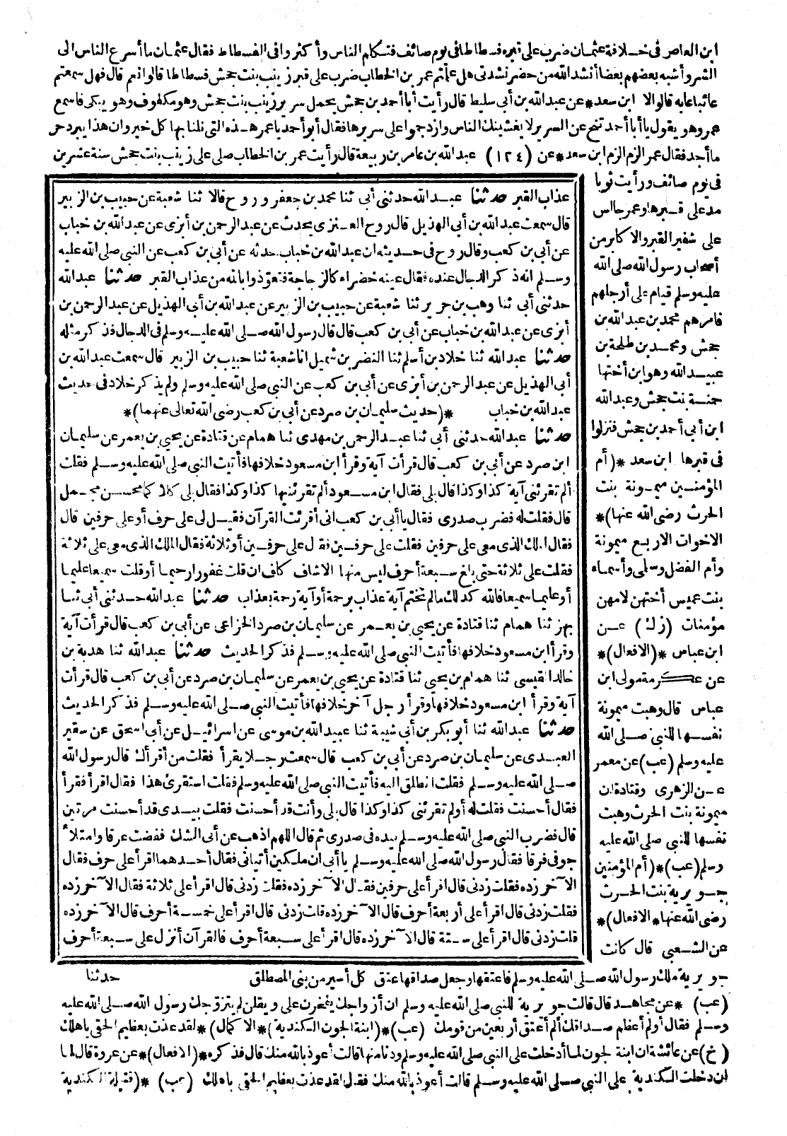 (21152) 21470- حَدَّثَنَا عَبْدُ اللهِ حَدَّثَنَا أَبُو بَكْرِ بْنُ أَبِي شَيْبَةَ ، حَدَّثَنَا عُبَيْدُ اللهِ بْنُ مُوسَى ، عَنْ إِسْرَائِيلَ ، عَنْ أَبِي إِسْحَاقَ ، عَنْ سُقَيْرٍ الْعَبْدِيِّ ، عَنْ سُلَيْمَانَ بْنِ صُرَدٍ ، عَنْ أُبَيِّ بْنِ كَعْبٍ ، قَالَ : سَمِعْتُ رَجُلاً يَقْرَأُ ، فَقُلْتُ : مَنْ أَقْرَأَكَ ؟ قَالَ : رَسُولُ اللهِ صَلَّى اللَّهُ عَلَيْهِ وَسَلَّمَ ، فَقُلْتُ : انْطَلِقْ إِلَيْهِ ، فَأَتَيْتُ النَّبِيَّ صَلَّى اللَّهُ عَلَيْهِ وَسَلَّمَ ، فَقُلْتُ : اسْتَقْرِئْ هَذَا ، فَقَالَ : اقْرَأْ فَقَرَأَ ، فَقَالَ : أَحْسَنْتَ فَقُلْتُ لَهُ : أَوَلَمْ تُقْرِئْنِي كَذَا وَكَذَا ؟ قَالَ : بَلَى ، وَأَنْتَ قَدْ أَحْسَنْتَ فَقُلْتُ بِيَدَيَّ : قَدْ أَحْسَنْتَ مَرَّتَيْنِ ، قَالَ : فَضَرَبَ النَّبِيُّ صَلَّى اللَّهُ عَلَيْهِ وَسَلَّمَ بِيَدِهِ فِي صَدْرِي ، ثُمَّ قَالَ : اللَّهُمَّ أَذْهِبْ عَنْ أُبَيٍّ الشَّكَّ فَفِضْتُ عَرَقًا ، وَامْتَلأَ جَوْفِي فَرَقًا ، فَقَالَ رَسُولُ اللهِ صَلَّى اللَّهُ عَلَيْهِ وَسَلَّمَ : يَا أُبَيُّ ، إِنَّ مَلَكَيْنِ أَتَيَانِي ، فَقَالَ أَحَدُهُمَا : اقْرَأْ عَلَى حَرْفٍ ، فَقَالَ الآخَرُ : زِدْهُ ، فَقُلْتُ : زِدْنِي ، قَالَ : اقْرَأْ عَلَى حَرْفَيْنِ ، فَقَالَ الآخَرُ : زِدْهُ ، فَقُلْتُ : زِدْنِي ، قَالَ : اقْرَأْ عَلَى ثَلاَثَةٍ ، فَقَالَ الآخَرُ : زِدْهُ ، فَقُلْتُ : زِدْنِي ، قَالَ : اقْرَأْ عَلَى أَرْبَعَةِ أَحْرُفٍ ، قَالَ الآخَرُ : زِدْهُ ، قُلْتُ : زِدْنِي ، قَالَ : اقْرَأْ عَلَى خَمْسَةِ أَحْرُفٍ ، قَالَ الآخَرُ : زِدْهُ ، قُلْتُ : زِدْنِي ، قَالَ : اقْرَأْ عَلَى سِتَّةٍ ، قَالَ الآخَرُ : زِدْهُ ، قَالَ : اقْرَأْ عَلَى سَبْعَةِ أَحْرُفٍ ، فَالْقُرْآنُ أُنْزِلَ عَلَى سَبْعَةِ أَحْرُفٍ.