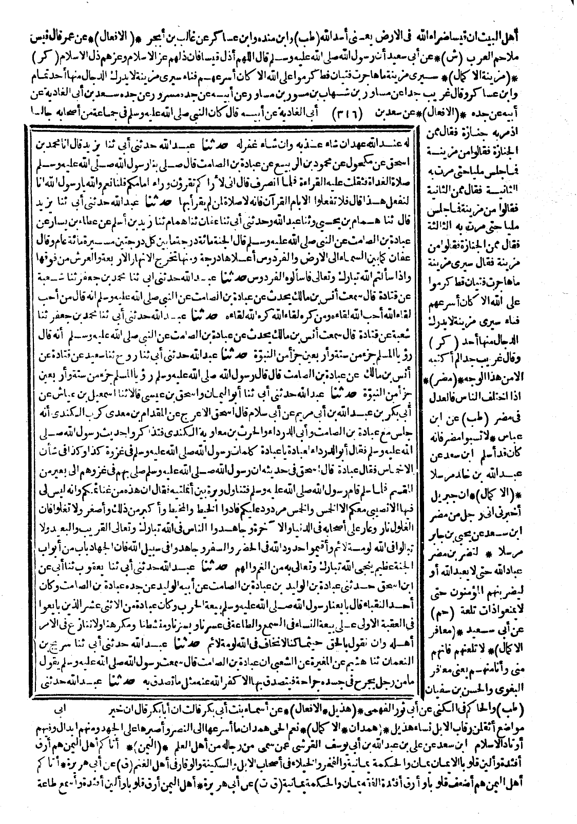 (22699) 23075- حَدَّثَنَا أَبُو الْيَمَانِ ، وَإِسْحَاقُ بْنُ عِيسَى قَالاَ : حَدَّثَنَا إِسْمَاعِيلُ بْنُ عَيَّاشٍ ، عَنْ أَبِي بَكْرِ بْنِ عَبْدِ اللهِ بْنِ أَبِي مَرْيَمَ ، عَنْ أَبِي سَلاَّمٍ قَالَ : إِسْحَاقُ الأَعْرَجِ ، عَنِ الْمِقْدَامِ بْنِ مَعْدِي كَرِبَ الْكِنْدِيِّ أَنَّهُ جَلَسَ مَعَ عُبَادَةَ بْنِ الصَّامِتِ ، وَأَبِي الدَّرْدَاءِ ، وَالْحَارِثِ بْنِ مُعَاوِيَةَ الْكِنْدِيِّ ، فَتَذَاكَرُوا حَدِيثَ رَسُولِ اللهِ صَلَّى اللَّهُ عَلَيْهِ وَسَلَّمَ فَقَالَ : أَبُو الدَّرْدَاءِ ، لِعُبَادَةَ : يَا عُبَادَةُ كَلِمَاتُ رَسُولِ اللهِ صَلَّى اللَّهُ عَلَيْهِ وَسَلَّمَ فِي غَزْوَةِ كَذَا ، فِي شَأْنِ الأَخْمَاسِ ؟ فَقَالَ : عُبَادَةُ قَالَ : إِسْحَاقُ فِي حَدِيثِهِ ، إِنَّ رَسُولَ اللهِ صَلَّى اللَّهُ عَلَيْهِ وَسَلَّمَ صَلَّى بِهِمْ فِي غَزْوِهِمْ إِلَى بَعِيرٍ مِنَ الْمَقْسِمِ ، فَلَمَّا سَلَّمَ قَامَ رَسُولُ اللهِ صَلَّى اللَّهُ عَلَيْهِ وَسَلَّمَ ، فَتَنَاوَلَ وَبَرَةً بَيْنَ أُنْمُلَتَيْهِ فَقَالَ : إِنَّ هَذِهِ مِنْ غَنَائِمِكُمْ ، وَإِنَّهُ لَيْسَ لِي فِيهَا إِلاَّ نَصِيبِي مَعَكُمْ إِلاَّ الْخُمُسُ ، وَالْخُمُسُ مَرْدُودٌ عَلَيْكُمْ ، فَأَدُّوا الْخَيْطَ وَالْمَخِيطَ ، وَأَكْبَرَ مِنْ ذَلِكَ وَأَصْغَرَ ، وَلاَ تَغُلُّوا ؛ فَإِنَّ الْغُلُولَ نَارٌ وَعَارٌ عَلَى أَصْحَابِهِ فِي الدُّنْيَا وَالآخِرَةِ ، وَجَاهِدُوا النَّاسَ فِي اللهِ الْقَرِيبَ وَالْبَعِيدَ ، وَلاَ تُبَالُوا فِي اللهِ لَوْمَةَ لاَئِمٍ ، وَأَقِيمُوا حُدُودَ اللهِ فِي الْحَضَرِ وَالسَّفَرِ ، وَجَاهِدُوا فِي سَبِيلِ اللهِ ؛ فَإِنَّ الْجِهَادَ بَابٌ مِنْ أَبْوَابِ الْجَنَّةِ عَظِيمٌ يُنَجِّي اللَّهُ بِهِ مِنَ الْهَمِّ وَالْغَمِّ.