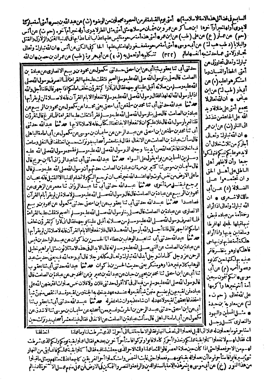 (22752) 23132- حَدَّثَنَا يَعْقُوبُ ، حَدَّثَنَا أَبِي ، عَنِ ابْنِ إِسْحَاقَ ، حَدَّثَنَا مُحَمَّدُ بْنُ يَحْيَى بْنِ حَبَّانَ ، عَنْ عَبْدِ اللهِ بْنِ مُحَيْرِيزٍ الْجُمَحِيِّ ، عَنِ الْمُخْدَجِيِّ ، عَنْ عُبَادَةَ بْنِ الصَّامِتِ قَالَ : قَالَ رَسُولُ اللهِ صَلَّى اللَّهُ عَلَيْهِ وَسَلَّمَ ، مِنْ فِيهِ إِلَى فِيَّ ، لاَ أَقُولُ حَدَّثَنِي فُلاَنٌ وَلاَ فُلاَنٌ ، خَمْسُ صَلَوَاتٍ افْتَرَضَهُنَّ اللَّهُ عَلَى عِبَادِهِ فَمَنْ لَقِيَهُ بِهِنَّ لَمْ يُضَيِّعْ مِنْهُنَّ شَيْئًا لَقِيَهُ ، وَلَهُ عِنْدَهُ عَهْدٌ يُدْخِلُهُ بِهِ الْجَنَّةَ ، وَمَنْ لَقِيَهُ وَقَدْ انْتَقَصَ مِنْهُنَّ شَيْئًا اسْتِخْفَافًا بِحَقِّهِنَّ لَقِيَهُ ، وَلاَ عَهْدَ لَهُ إِنْ شَاءَ عَذَّبَهُ ، وَإِنْ شَاءَ غَفَرَ لَهُ.