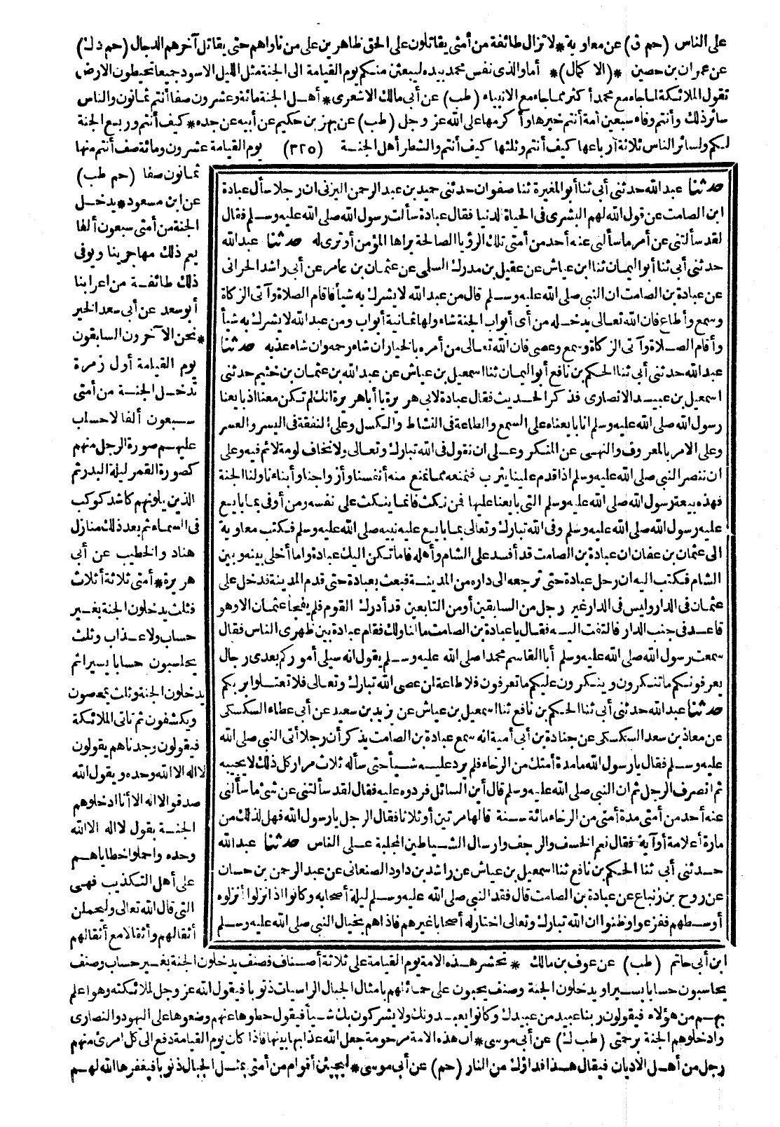(22770) 23151- حَدَّثَنَا الْحَكَمُ بْنُ نَافِعٍ ، حَدَّثَنَا إِسْمَاعِيلُ بْنُ عَيَّاشٍ ، عَنْ يَزِيدَ بْنِ سَعِيدٍ ، عَنْ أَبِي عَطَاءٍ يَزِيدَ بْنِ يَزِيدَ السَّكْسَكِيِّ ، عَنْ مُعَاذِ بْنِ سَعْدٍ السَّكْسَكِيِّ ، عَنْ جُنَادَةَ بْنِ أَبِي أُمَيَّةَ أَنَّهُ سَمِعَ عُبَادَةَ بْنَ الصَّامِتِ يَذْكُرُ ، أَنَّ رَجُلاً أَتَى النَّبِيَّ صَلَّى اللَّهُ عَلَيْهِ وَسَلَّمَ فَقَالَ : يَا رَسُولَ اللهِ ، مَا مُدَّةُ أُمَّتِكَ مِنَ الرَّخَاءِ ؟ فَلَمْ يَرُدَّ عَلَيْهِ شَيْئًا حَتَّى سَأَلَهُ ثَلاَثَ مِرَارٍ كُلُّ ذَلِكَ لاَ يُجِيبُهُ ، ثُمَّ انْصَرَفَ الرَّجُلُ ، ثُمَّ إِنَّ النَّبِيَّ صَلَّى اللَّهُ عَلَيْهِ وَسَلَّمَ قَالَ : أَيْنَ السَّائِلُ ؟ فَرَدُّوهُ عَلَيْهِ ، فَقَالَ : لَقَدْ سَأَلْتَنِي عَنْ شَيْءٍ مَا سَأَلَنِي عَنْهُ أَحَدٌ مِنْ أُمَّتِي ، مُدَّةُ أُمَّتِي مِنَ الرَّخَاءِ مِئَةُ سَنَةٍ ، قَالَهَا مَرَّتَيْنِ أَوْ ثَلاَثًا ، فَقَالَ الرَّجُلُ : يَا رَسُولَ اللهِ ، فَهَلْ لِذَلِكَ مِنْ أَمَارَةٍ أَوْ عَلاَمَةٍ أَوْ آيَةٍ ؟ فَقَالَ : نَعَمْ ، الْخَسْفُ وَالرَّجْفُ ، وَإِرْسَالُ الشَّيَاطِينِ الْمُجَلِّبَةِ عَلَى النَّاسِ.