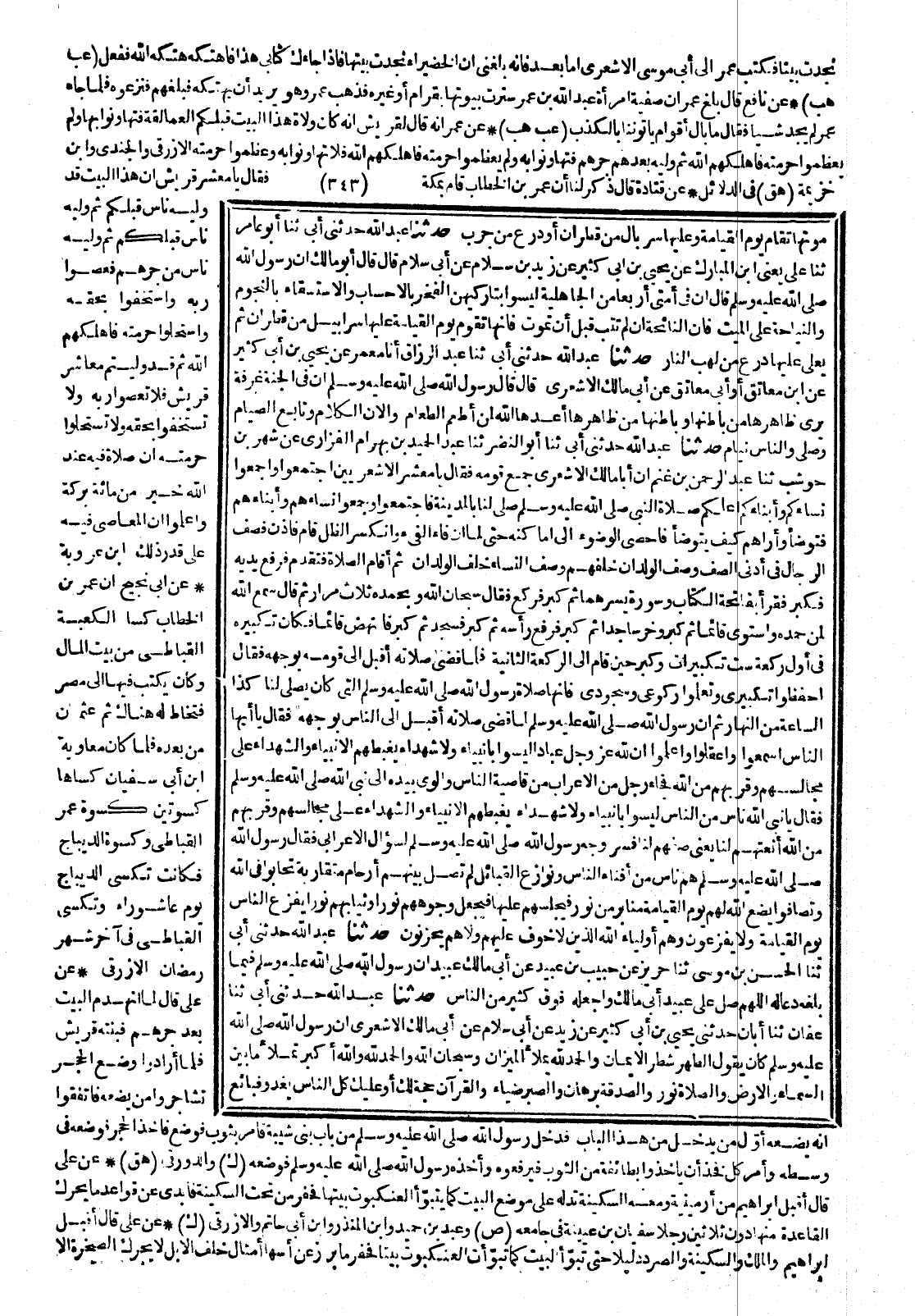 (22906) 23294- حَدَّثَنَا أَبُو النَّضْرِ ، حَدَّثَنَا عَبْدُ الْحَمِيدِ بْنُ بَهْرَامَ الْفَزَارِيُّ ، عَنْ شَهْرِ بْنِ حَوْشَبٍ ، حَدَّثَنَا عَبْدُ الرَّحْمَنِ بْنُ غَنْمٍ ، أَنَّ أَبَا مَالِكٍ الأَشْعَرِيَّ جَمَعَ قَوْمَهُ فَقَالَ : يَا مَعْشَرَ الأَشْعَرِيِّينَ اجْتَمِعُوا وَاجْمَعُوا نِسَاءَكُمْ ، وَأَبْنَاءَكُمْ أُعَلِّمْكُمْ صَلاَةَ النَّبِيِّ صَلَّى اللَّهُ عَلَيْهِ وَسَلَّمَ الَّتِي صَلَّى لَنَا بِالْمَدِينَةِ فَاجْتَمَعُوا ، وَجَمَعُوا نِسَاءَهُمْ وَأَبْنَاءَهُمْ ، فَتَوَضَّأَ وَأَرَاهُمْ كَيْفَ يَتَوَضَّأُ ، فَأَحْصَى الْوُضُوءَ إِلَى أَمَاكِنِهِ حَتَّى لَمَّا أَنْ فَاءَ الْفَيْءُ ، وَانْكَسَرَ الظِّلُّ قَامَ ، فَأَذَّنَ فَصَفَّ الرِّجَالَ فِي أَدْنَى الصَّفِّ ، وَصَفَّ الْوِلْدَانَ خَلْفَهُمْ ، وَصَفَّ النِّسَاءَ خَلْفَ الْوِلْدَانِ ، ثُمَّ أَقَامَ الصَّلاَةَ ، فَتَقَدَّمَ فَرَفَعَ يَدَيْهِ وَكَبَّرَ ، فَقَرَأَ بِفَاتِحَةِ الْكِتَابِ وَسُورَةٍ يُسِرُّهُمَا ، ثُمَّ كَبَّرَ فَرَكَعَ فَقَالَ : سُبْحَانَ اللهِ وَبِحَمْدِهِ ثَلاَثَ مِرَارٍ ، ثُمَّ قَالَ : سَمِعَ اللَّهُ لِمَنْ حَمِدَهُ ، وَاسْتَوَى قَائِمًا ، ثُمَّ كَبَّرَ ، وَخَرَّ سَاجِدًا ، ثُمَّ كَبَّرَ فَرَفَعَ رَأْسَهُ ، ثُمَّ كَبَّرَ فَسَجَدَ ، ثُمَّ كَبَّرَ فَانْتَهَضَ قَائِمًا ، فَكَانَ تَكْبِيرُهُ فِي أَوَّلِ رَكْعَةٍ سِتَّ تَكْبِيرَاتٍ ، وَكَبَّرَ حِينَ قَامَ إِلَى الرَّكْعَةِ الثَّانِيَةِ ، فَلَمَّا قَضَى صَلاَتَهُ أَقْبَلَ إِلَى قَوْمِهِ بِوَجْهِهِ ، فَقَالَ : احْفَظُوا تَكْبِيرِي ، وَتَعَلَّمُوا رُكُوعِي وَسُجُودِي ؛ فَإِنَّهَا صَلاَةُ رَسُولِ اللهِ صَلَّى اللَّهُ عَلَيْهِ وَسَلَّمَ الَّتِي كَانَ يُصَلِّي لَنَا كَذَي السَّاعَةِ مِنَ النَّهَارِ ، ثُمَّ إِنَّ رَسُولَ اللهِ صَلَّى اللَّهُ عَلَيْهِ وَسَلَّمَ لَمَّا قَضَى صَلاَتَهُ أَقْبَلَ إِلَى النَّاسِ بِوَجْهِهِ فَقَالَ : يَا أَيُّهَا النَّاسُ اسْمَعُوا وَاعْقِلُوا ، وَاعْلَمُوا أَنَّ لِلَّهِ عِبَادًا لَيْسُوا بِأَنْبِيَاءَ وَلاَ شُهَدَاءَ يَغْبِطُهُمْ ، النَّبِيُّونَ وَالشُّهَدَاءُ عَلَى مَجَالِسِهِمْ وَقُرْبِهِمْ مِنَ اللهِ . فَجَثَى رَجُلٌ مِنَ الأَعْرَابِ مِنْ قَاصِيَةِ النَّاسِ ، وَأَلْوَى بِيَدِهِ إِلَى نَبِيِّ اللهِ صَلَّى اللَّهُ عَلَيْهِ وَسَلَّمَ فَقَالَ : يَا نَبِيَّ اللهِ نَاسٌ مِنَ النَّاسِ لَيْسُوا بِأَنْبِيَاءَ وَلاَ شُهَدَاءَ يَغْبِطُهُمُ الأَنْبِيَاءُ وَالشُّهَدَاءُ عَلَى مَجَالِسِهِمْ وَقُرْبِهِمْ مِنَ اللهِ انْعَتْهُمْ لَنَا حَلِّمْهُمْ لَنَا ، يَعْنِي صِفْهُمْ لَنَا ، شَكِّلْهُمْ لَنَا فَسُرَّ وَجْهُ رَسُولِ اللهِ صَلَّى اللَّهُ عَلَيْهِ وَسَلَّمَ ، لِسُؤَالِ الأَعْرَابِيِّ فَقَالَ رَسُولُ اللهِ صَلَّى اللَّهُ عَلَيْهِ وَسَلَّمَ : هُمْ نَاسٌ مِنْ أَفْنَاءِ النَّاسِ وَنَوَازِعِ الْقَبَائِلِ لَمْ تَصِلْ بَيْنَهُمْ أَرْحَامٌ مُتَقَارِبَةٌ تَحَابُّوا فِي اللهِ وَتَصَافَوْا ، يَضَعُ اللَّهُ لَهُمْ يَوْمَ الْقِيَامَةِ مَنَابِرَ مِنْ نُورٍ فَيُجْلِسُهُمْ عَلَيْهَا فَيَجْعَلُ وُجُوهَهُمْ نُورًا ، وَثِيَابَهُمْ نُورًا ، يَفْزَعُ النَّاسُ يَوْمَ الْقِيَامَةِ وَلاَ يَفْزَعُونَ ، وَهُمْ أَوْلِيَاءُ اللهِ الَّذِينَ لاَ خَوْفٌ عَلَيْهِمْ وَلاَ هُمْ يَحْزَنُونَ.