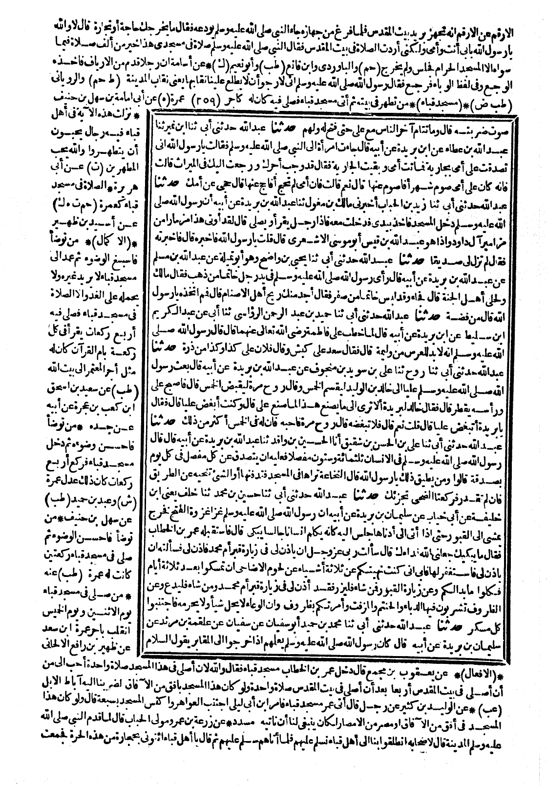 (23038) 23426- حَدَّثَنَا حُسَيْنُ بْنُ مُحَمَّدٍ ، حَدَّثَنَا خَلَفٌ ، يَعْنِي ابْنَ خَلِيفَةَ ، عَنْ أَبِي جَنَابٍ ، عَنْ سُلَيْمَانَ بْنِ بُرَيْدَةَ ، عَنْ أَبِيهِ ، أَنَّ رَسُولَ اللهِ صَلَّى اللَّهُ عَلَيْهِ وَسَلَّمَ غَزَا غَزْوَةَ الْفَتْحِ ، فَخَرَجَ يَمْشِي إِلَى الْقُبُورِ حَتَّى إِذَا أَتَى أَدْنَاهَا جَلَسَ إِلَيْهِ كَأَنَّهُ يُكَلِّمُ إِنْسَانًا جَالِسًا يَبْكِي قَالَ : فَاسْتَقْبَلَهُ عُمَرُ بْنُ الْخَطَّابِ فَقَالَ : مَا يُبْكِيكَ جَعَلَنِي اللَّهُ فِدَاءَكَ . قَالَ : سَأَلْتُ رَبِّي أَنْ يَأْذَنَ لِي فِي زِيَارَةِ قَبْرِ أُمِّ مُحَمَّدٍ ، فَأَذِنَ لِي فَسَأَلْتُهُ أَنْ يَأْذَنَ لِي فَأَسْتَغْفِرَ لَهَا فَأَبَى ، إِنِّي كُنْتُ نَهَيْتُكُمْ عَنْ ثَلاَثَةِ أَشْيَاءَ : عَنْ لُحُومِ الأَضَاحِيِّ أَنْ تُمْسِكُوا بَعْدَ ثَلاَثَةِ أَيَّامٍ ، فَكُلُوا مَا بَدَا لَكُمْ ، وَعَنْ زِيَارَةِ الْقُبُورِ فَمَنْ شَاءَ فَلْيَزُرْ ؛ فَقَدْ أُذِنَ لِي فِي زِيَارَةِ قَبْرِ أُمِّ مُحَمَّدٍ ، وَمَنْ شَاءَ فَلْيَدَعْ ، وَعَنِ الظُّرُوفِ تَشْرَبُونَ فِيهَا الدُّبَّاءَ والْحَنْتَمَ وَالْمُزَفَّتَ وَأَمَرْتُكُمْ بِظُرُوفٍ ، وَإِنَّ الْوِعَاءَ لاَ يُحِلُّ شَيْئًا ، وَلاَ يُحَرِّمُهُ ، فَاجْتَنِبُوا كُلَّ مُسْكِرٍ.