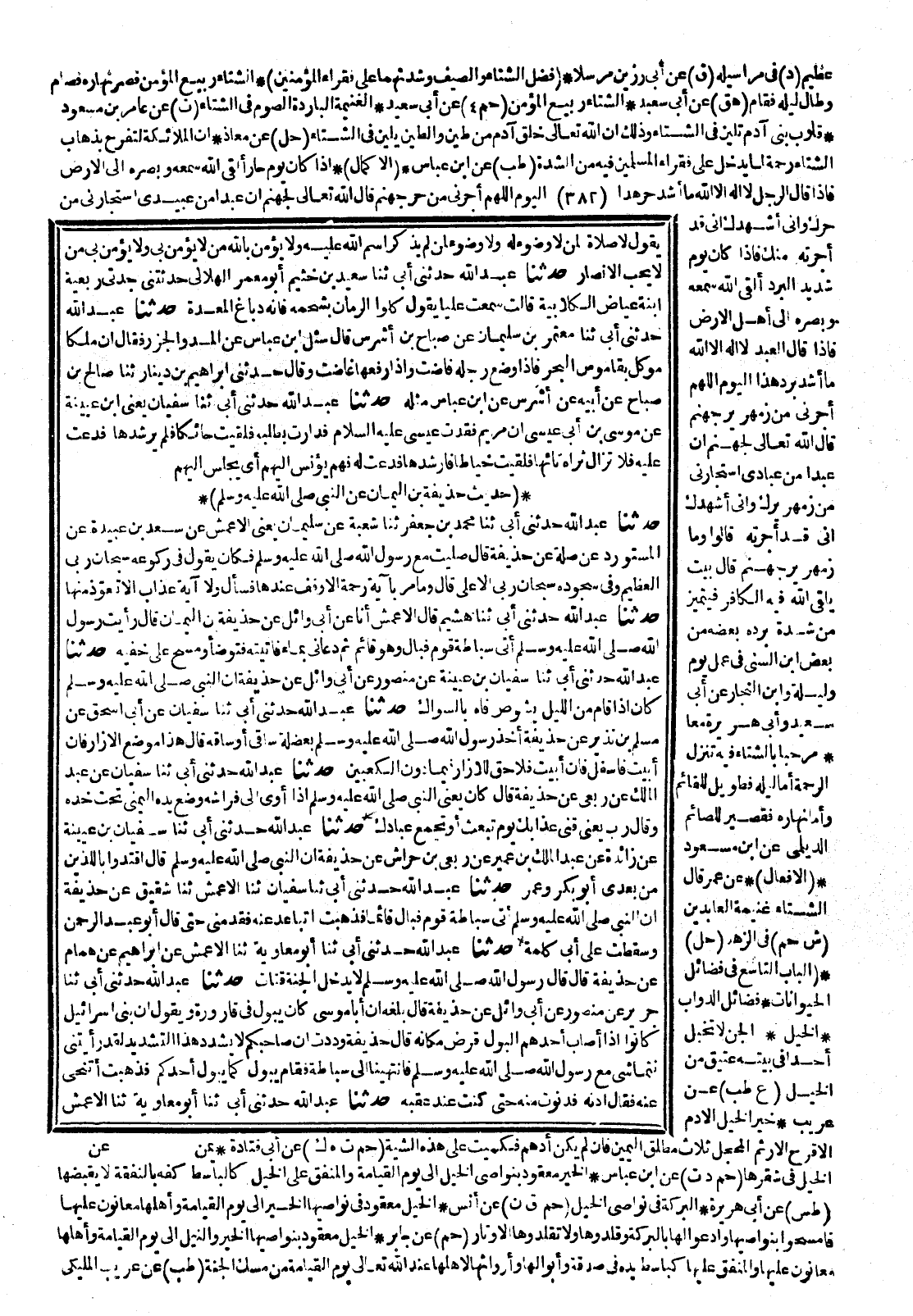 (23249) 23638- حَدَّثَنَا أَبُو مُعَاوِيَةَ ، حَدَّثَنَا الأَعْمَشُ ، عَنْ خُثَيْمَةَ ، عَنْ أَبِي حُذَيْفَةَ ، قَالَ أَبُو عَبْدِ الرَّحْمَنِ : اسْمُهُ سَلَمَةُ بْنُ الْهَيْثَمِ بْنِ صُهَيْبٍ مِنْ أَصْحَابِ ابْنِ مَسْعُودٍ ، عَنْ حُذَيْفَةَ قَالَ : كُنَّا إِذَا حَضَرْنَا مَعَ النَّبِيِّ صَلَّى اللَّهُ عَلَيْهِ وَسَلَّمَ عَلَى طَعَامٍ لَمْ نَضَعْ أَيْدِيَنَا حَتَّى يَبْدَأَ رَسُولُ اللهِ صَلَّى اللَّهُ عَلَيْهِ وَسَلَّمَ فَيَضَعَ يَدَهُ ، وَإِنَّا حَضَرْنَا مَعَهُ طَعَامًا فَجَاءَتْ جَارِيَةٌ كَأَنَّمَا تُدْفَعُ ، فَذَهَبَتْ تَضَعُ يَدَهَا فِي الطَّعَامِ ، فَأَخَذَ رَسُولُ اللهِ صَلَّى اللَّهُ عَلَيْهِ وَسَلَّمَ بِيَدِهَا ، وَجَاءَ أَعْرَابِيٌّ كَأَنَّمَا يُدْفَعُ ، فَذَهَبَ يَضَعُ يَدَهُ فِي الطَّعَامِ ، فَأَخَذَ رَسُولُ اللهِ صَلَّى اللَّهُ عَلَيْهِ وَسَلَّمَ بِيَدِهِ ، فَقَالَ رَسُولُ اللهِ صَلَّى اللَّهُ عَلَيْهِ وَسَلَّمَ : إِنَّ الشَّيْطَانَ يَسْتَحِلُّ الطَّعَامَ إِذَا لَمْ يُذْكَرْ اسْمُ اللهِ عَلَيْهِ ، وَإِنَّهُ جَاءَ بِهَذِهِ الْجَارِيَةِ لِيَسْتَحِلَّ بِهَا فَأَخَذْتُ بِيَدِهَا ، وَجَاءَ بِهَذَا الأَعْرَابِيِّ لِيَسْتَحِلَّ بِهِ فَأَخَذْتُ بِيَدِهِ ، وَالَّذِي نَفْسِي بِيَدِهِ ، إِنَّ يَدَهُ فِي يَدِي مَعَ يَدِهِمَا - يَعْنِي : الشَّيْطَانَ -.