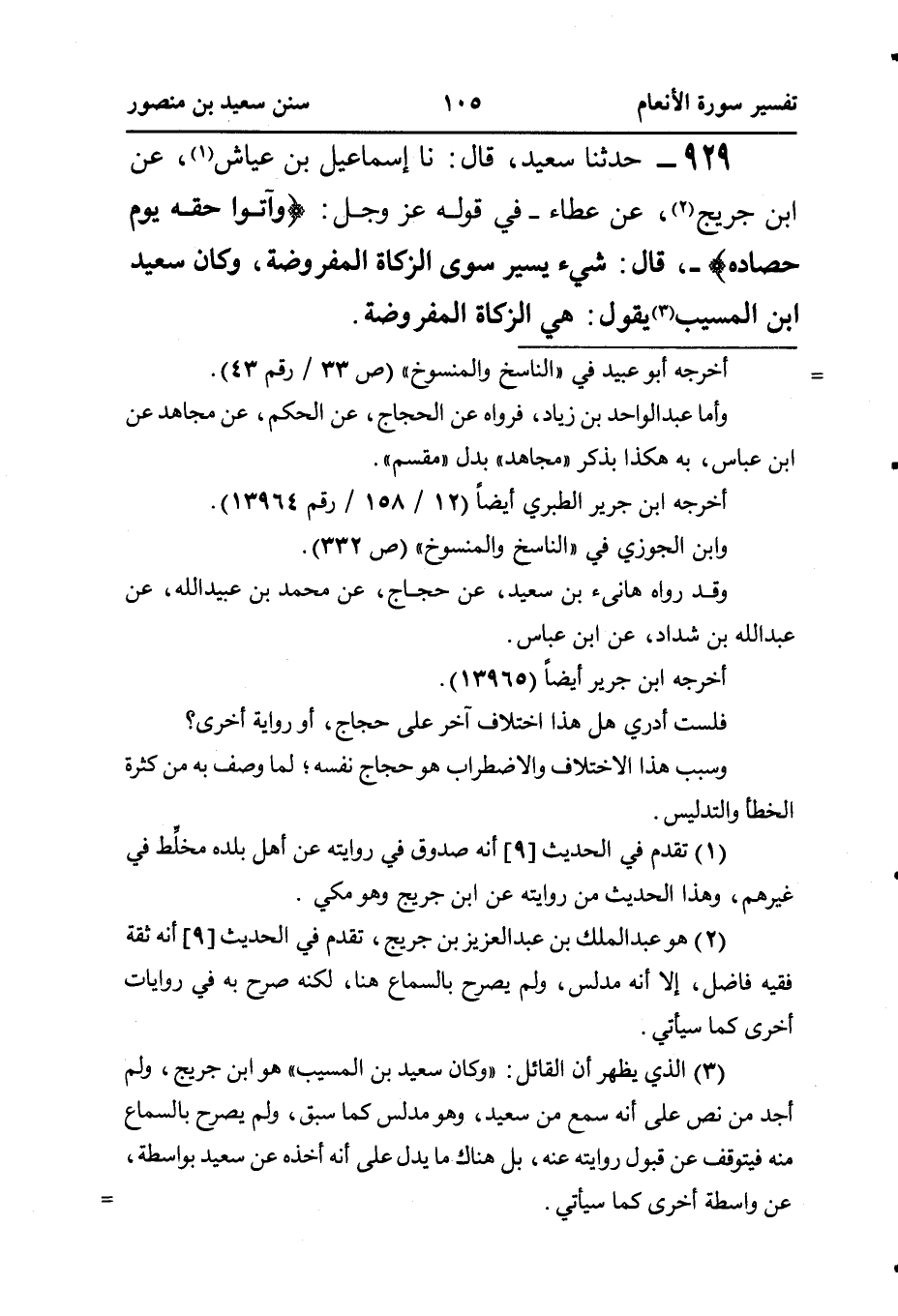 ٩٢٩ - حَدَّثَنَا سَعِيدٌ، قَالَ: نا إِسْمَاعِيلُ بْنُ عَيَّاشٍ (¬١)، عَنِ ابْنِ جُرَيْجٍ (¬٢)، عَنْ عَطَاءٍ - فِي قَوْلِهِ عَزَّ وَجَلَّ: {وَآتُوا حَقَّهُ يَوْمَ حَصَادِهِ} - قَالَ: شَيْءٌ يَسِيرُ سِوَى الزَّكَاةِ الْمَفْرُوضَةِ، وَكَانَ سَعِيدُ بْنُ الْمُسَيِّبِ (¬٣)، يقول: هي الزكاة المفروضة.