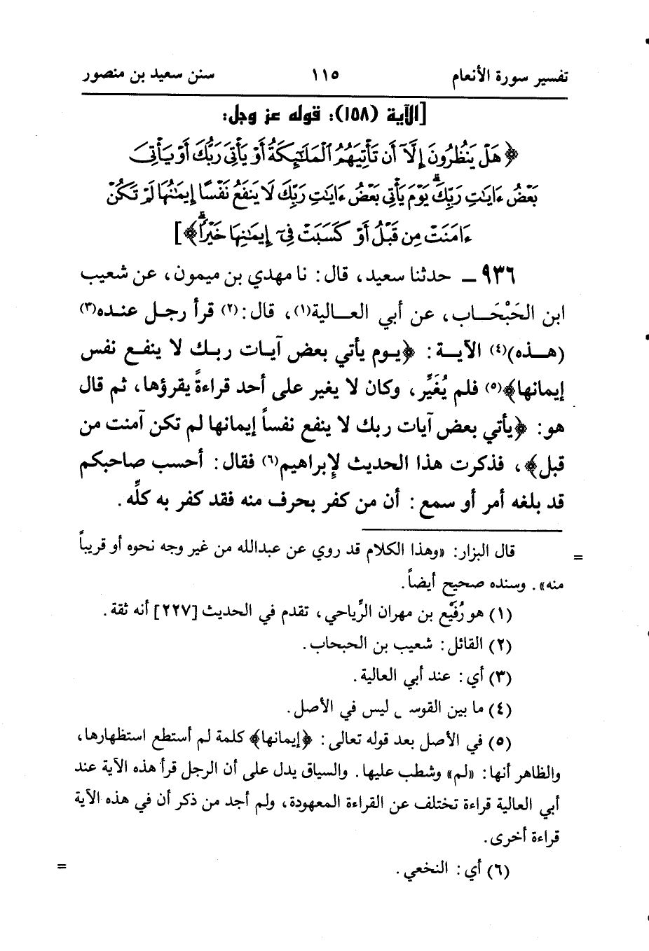 ٩٣٦ - حَدَّثَنَا سَعِيدٌ؛ قَالَ: نا مَهْدِيُّ بْنُ مَيْمُونٍ، عَنْ شُعَيْبِ بْنِ الحَبْحَاب، عَنْ أَبِي الْعَالِيَةِ (¬١)، قَالَ (¬٢): قَرَأَ رَجُلٌ عِنْدَهُ (¬٣) (هَذِهِ) (¬٤) الْآيَةَ: {يَوْمَ يَأْتِي بَعْضُ آيَاتِ رَبِّكَ لَا يَنْفَعُ نَفْسٌ إِيمَانُهَا} (¬٥) فَلَمْ يُغَيِّر، وَكَانَ لَا يُغَيِّرُ عَلَى أَحَدٍ قِرَاءَةً يَقْرَؤُهَا، ثُمَّ قَالَ هُوَ: {يَأْتِي بَعْضُ آيَاتِ رَبِّكَ لَا يَنْفَعُ نَفْسًا إِيمَانُهَا لَمْ تَكُنْ آمَنَتْ مِنْ قَبْلُ}، فَذَكَرْتُ هَذَا الْحَدِيثَ لِإِبْرَاهِيمَ (¬٦)، فَقَالَ: أَحْسَبُ صَاحِبَكُمْ قَدْ بَلَغَهُ أَمْرٌ أَوْ سَمِعَ: أَنَّ مَنْ كَفَرَ بِحَرْفٍ مِنْهُ فَقَدْ كَفَرَ بِهِ كلِّه.