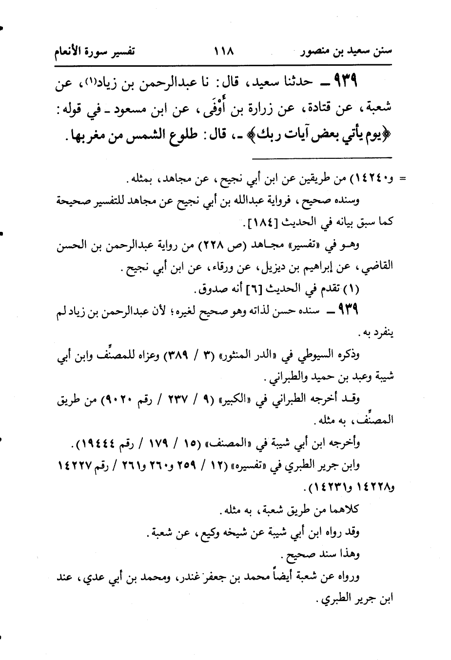 ٩٣٩ - حَدَّثَنَا سَعِيدٌ، قَالَ: نا عَبْدُ الرَّحْمَنِ بْنُ زِيَادٍ (¬١)، عَنْ شُعْبَةَ، عَنْ قَتَادَةَ، عَنْ زُرَارَةَ بْنِ أَوْفَى، عَنِ ابْنِ مَسْعُودٍ - فِي قَوْلِهِ: {يَوْمَ يَأْتِي بَعْضُ آيَاتِ رَبِّكَ} - قَالَ: طُلُوعُ الشَّمْسِ مِنْ مَغْرِبِهَا.