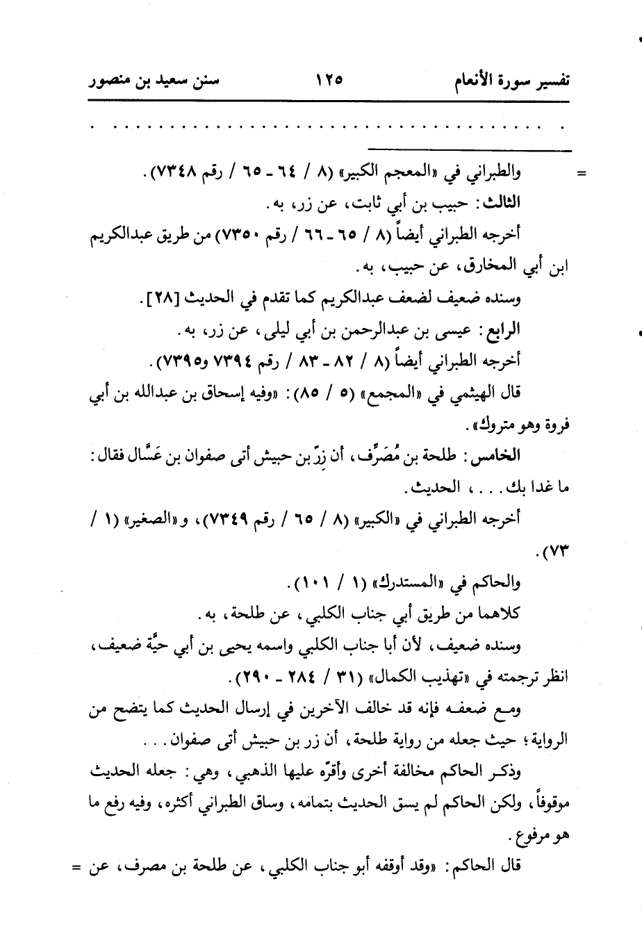 ومع ضعفه فإنه قد خالف الآخرين في إرسال الحديث كما يتضح من الرواية، حيث جعله من رواية طلحة، أن زر بن حبيش أتى صفوان ...