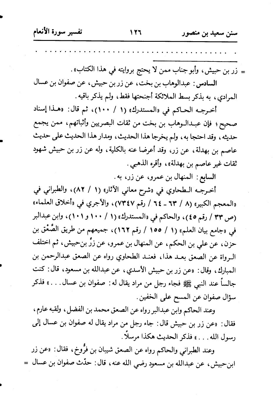 أخرجه الطحاوي في "شرح معاني الآثار" (١ / ٨٢) ، والطبراني في "المعجم الكبير" (٨ / ٦٣ - ٦٤ رقم ٧٣٤٧) ، والآجري في "أخلاق العلماء" (ص٣٣ رقم ٤٥) ، والحاكم في "المستدرك" (١ / ١٠٠ و ١٠١) ، وابن عبد البر في "جامع بيان العلم" (١ / ١٥٥ رقم ١٦٢) ، جميعهم من طريق الصَّعْق بن حزن، عن علي بن الحكم، عَنِ الْمِنْهَالِ بْنِ عَمْرٍو، عَنْ زرِّ بن حبيش، ثم اختلف الرواة عن الصعق بعد هذا، فعند الطحاوي رواه عن الصعق عبد الرحمن بن المبارك، وقال: ((عن زر بن حبيش الأسدي، عَنْ عَبْدِ اللَّهِ بْنِ مَسْعُودٍ، قال: كنت جالسًا عند النَّبِيِّ - صَلَّى اللهُ عَلَيْهِ وَسَلَّمَ - فجاء رجل من مراد يقال له: صفوان بن عسال ... )) ، فذكر سؤال صفوان عن المسح على الخفين.