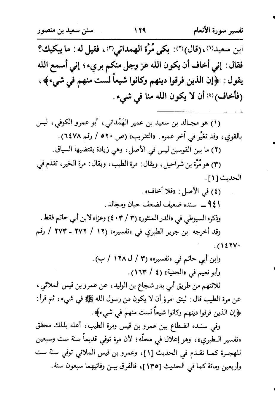 ابن سَعِيدٍ (¬١)، (قَالَ) (¬٢): بَكَى مُرَّة الْهَمْدَانِيُّ (¬٣)، فَقِيلَ لَهُ: مَا يُبْكِيكَ؟ فَقَالَ: إِنِّي أَخَافُ أَنْ يَكُونَ اللَّهُ عَزَّ وَجَلَّ مِنْكُمْ بَرِيءُ؛ إِنِّي أَسْمَعُ اللَّهَ يَقُولُ: {إِنَّ الَّذِينَ فَرَّقُوا دِينَهُمْ وَكَانُوا شِيَعًا لَسْتَ مِنْهُمْ فِي شَيْءٍ}، (فَأَخَافُ) (¬٤) أَنْ لَا يَكُونَ اللَّهُ منا في شيء.