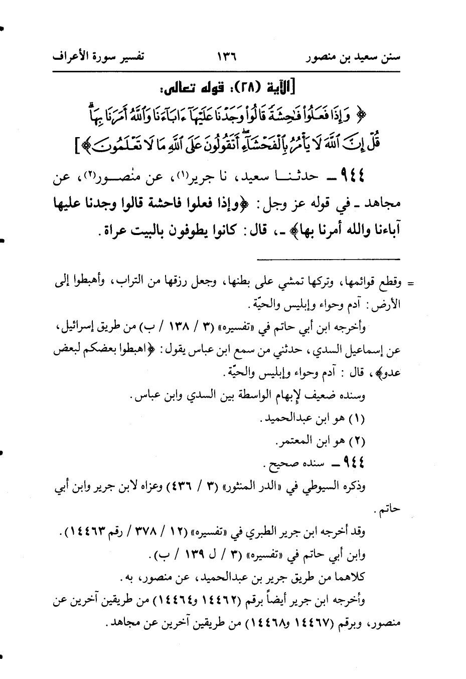 ٩٤٤ - حَدَّثَنَا سَعِيدٌ، قَالَ: نا جَرِيرٌ (¬١)، عَنْ مَنْصُورٍ (¬٢)، عَنْ مُجَاهِدٍ - فِي قَوْلِهِ عَزَّ وَجَلَّ: {وَإِذَا فَعَلُوا فَاحِشَةً قَالُوا وَجَدْنَا عَلَيْهَا آبَاءَنَا وَاللهُ أَمَرَنَا بِهَا} -، قَالَ: كَانُوا يَطُوفُونَ بِالْبَيْتِ عُرَاةً.