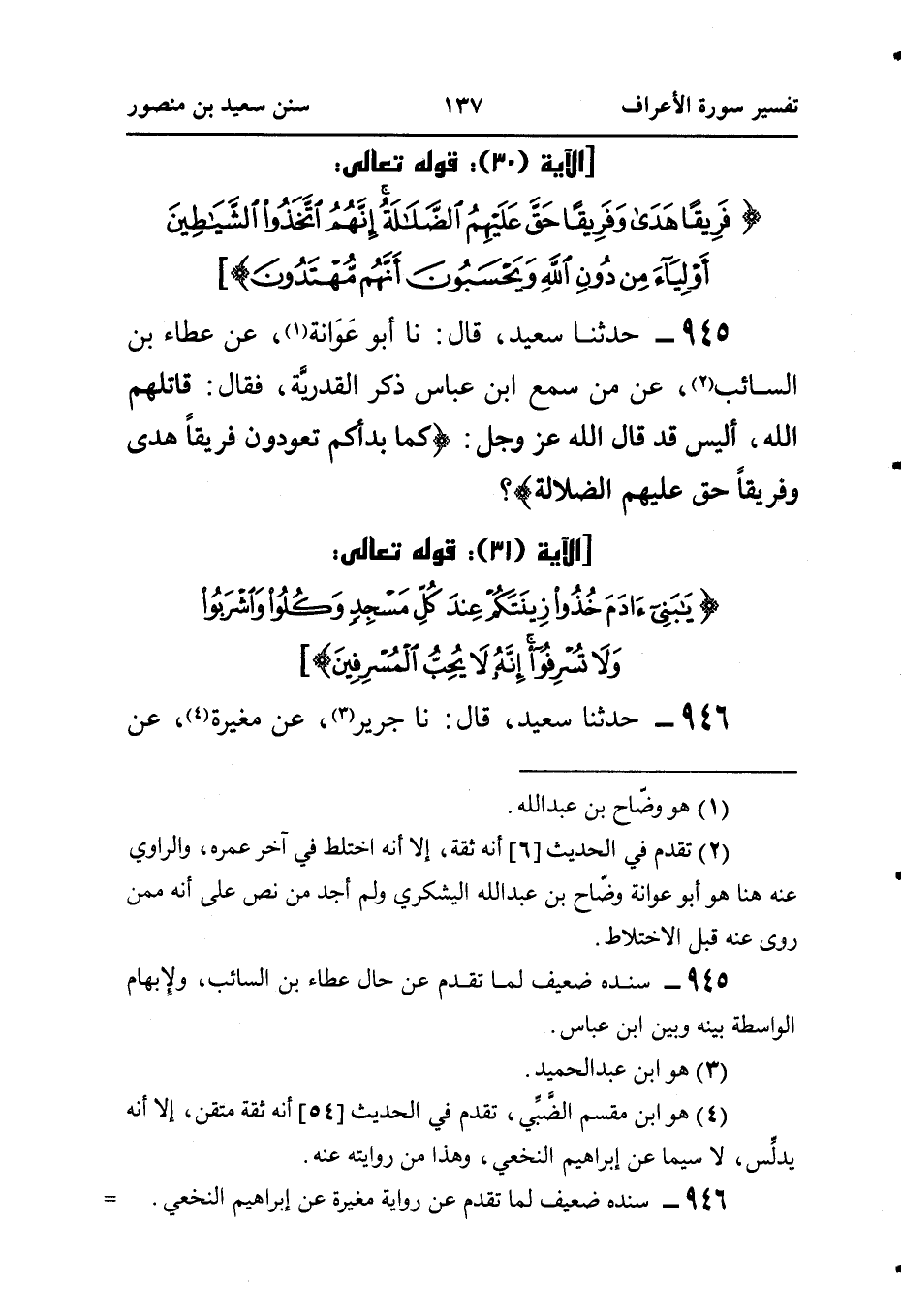 ٩٤٥ - حَدَّثَنَا سَعِيدٌ، قَالَ: نا أَبُو عَوَانة (¬١)، عَنْ عَطَاءِ بْنِ السَّائِبِ (¬٢)، عَنْ مَنْ، سَمِعَ ابْنَ عَبَّاسٍ، ذَكَرَ القدريَّة، فَقَالَ: قَاتَلَهُمُ اللَّهُ، أَلَيْسَ قَدْ قَالَ اللَّهُ عَزَّ وجل: {بَدَأَكُمْ تَعُودُونَ. فَرِيقًا هَدَى وَفَرِيقًا حَقَّ عَلَيْهِمُ الضَّلَالَةُ}؟