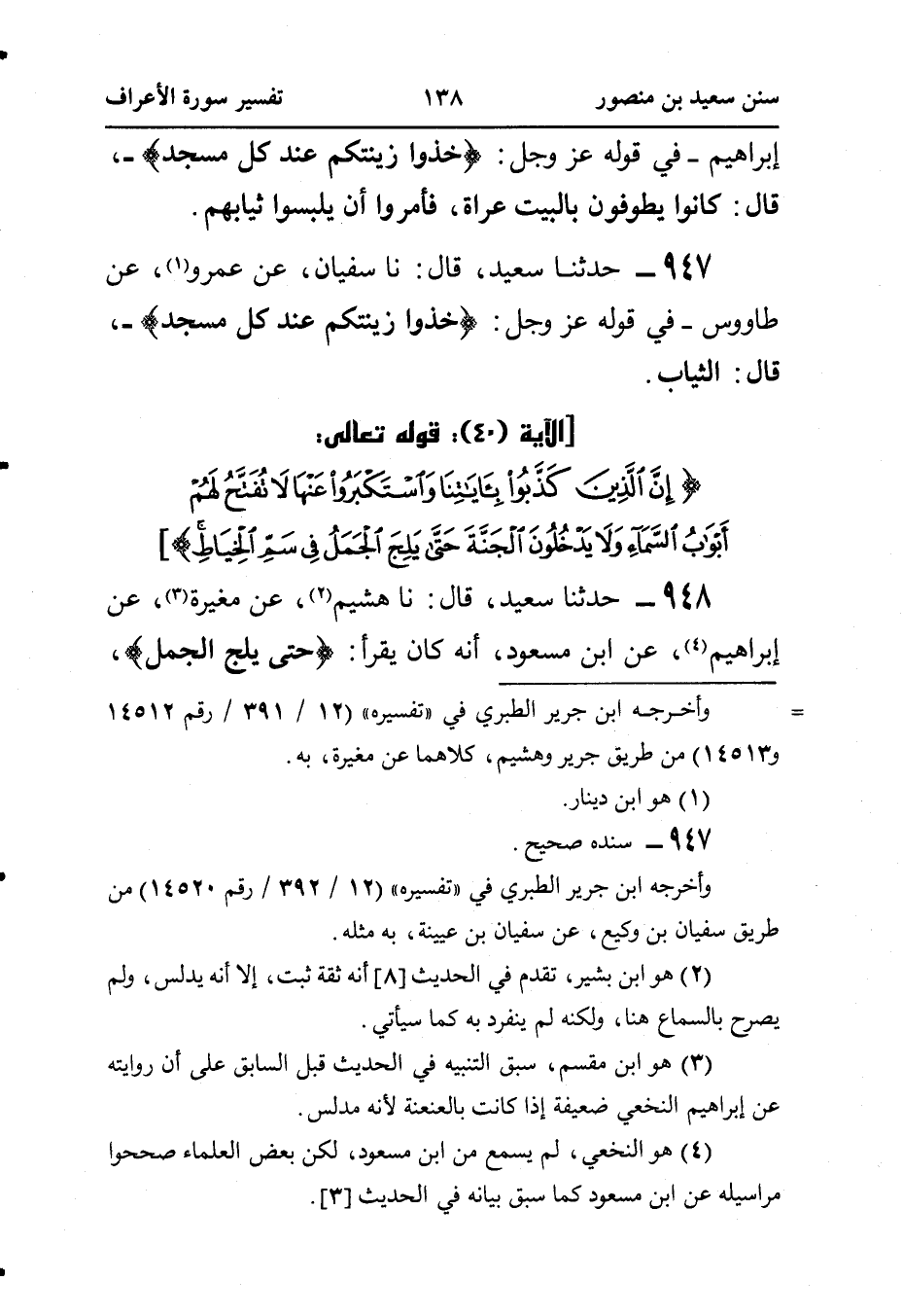 ٩٤٨ - حَدَّثَنَا سَعِيدٌ، قَالَ: نا هُشَيْمٌ (¬٢)، عَنْ مُغِيرَةَ (¬٣)، عَنْ إِبْرَاهِيمَ (¬٤)، عَنِ ابْنِ مَسْعُودٍ، أَنَّهُ كَانَ يَقْرَأُ {حتى يلج الجمل}،