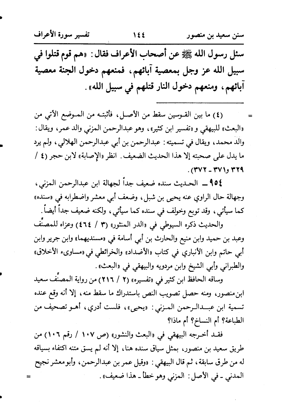 سُئِلَ رَسُولُ اللَّهِ صَلَّى اللهُ عَلَيْهِ وَسَلَّمَ عَنْ أَصْحَابِ الْأَعْرَافِ، فَقَالَ: ((هُمْ قَوْمٌ قُتِلُوا فِي سَبِيلِ اللَّهِ عَزَّ وَجَلَّ بِمَعْصِيَةِ آبَائِهِمْ، فَمَنَعَهُمْ دُخُولَ الْجَنَّةِ مَعْصِيَةُ آبَائِهِمْ، وَمَنَعَهُمْ دُخُولُ النَّارِ قَتْلُهُمْ في سبيل الله)).