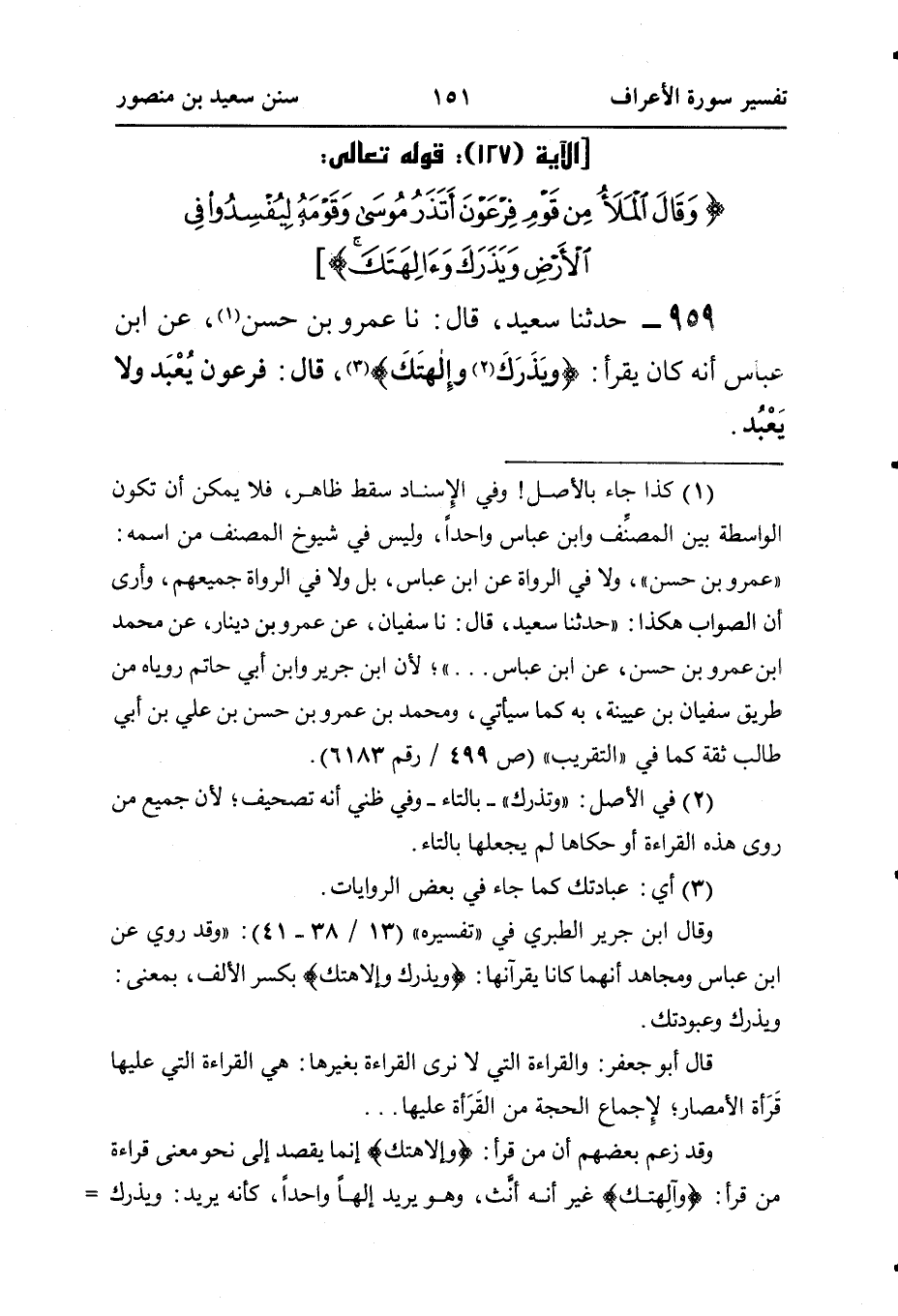 ٩٥٩ - حَدَّثَنَا سَعِيدٌ، قَالَ: نا عَمْرُو بْنُ حَسَنٍ (¬١)، عَنِ ابْنِ عَبَّاسٍ، أَنَّهُ كَانَ يَقْرَأُ: {ويَذَرَكَ (¬٢) وإِلهتَكَ} (¬٣)، قَالَ: فِرْعَوْنُ يُعْبَد وَلَا يَعْبُد.