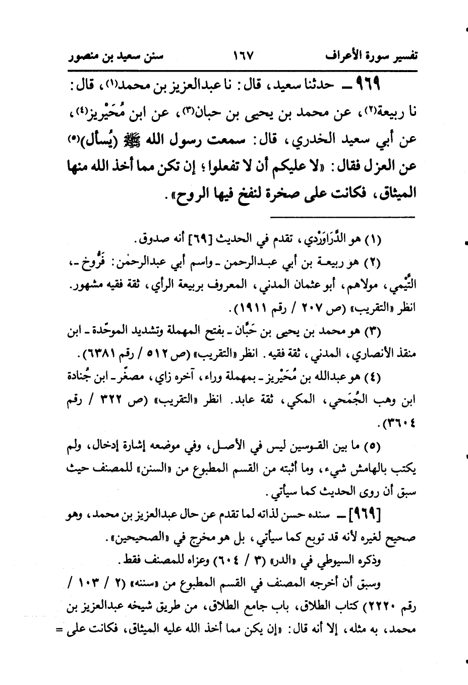 ٩٦٩ - حَدَّثَنَا سَعِيدٌ، قَالَ: نا عَبْدُ الْعَزِيزِ بْنُ مُحَمَّدٍ (¬١)، قَالَ: نا رَبِيعَةُ (¬٢)، عَنْ مُحَمَّدِ بْنِ يَحْيَى بْنِ حَبَّانَ (¬٣)، عَنِ ابْنِ مُحَيْريز (¬٤)، عَنْ أَبِي سَعِيدٍ الْخُدْرِيِّ، قَالَ: سَمِعْتُ، رَسُولَ اللَّهِ صَلَّى اللهُ عَلَيْهِ وَسَلَّمَ (يُسأل) (¬٥) عَنِ الْعَزْلِ فَقَالَ: ((لَا عَلَيْكُمُ أَنْ لَا تَفْعَلُوا؛ إِنْ تَكُنْ مِمَّا أَخَذَ اللَّهُ مِنْهَا الْمِيثَاقَ، فَكَانَتْ عَلَى صخرة لنفخ فيها الروح)).