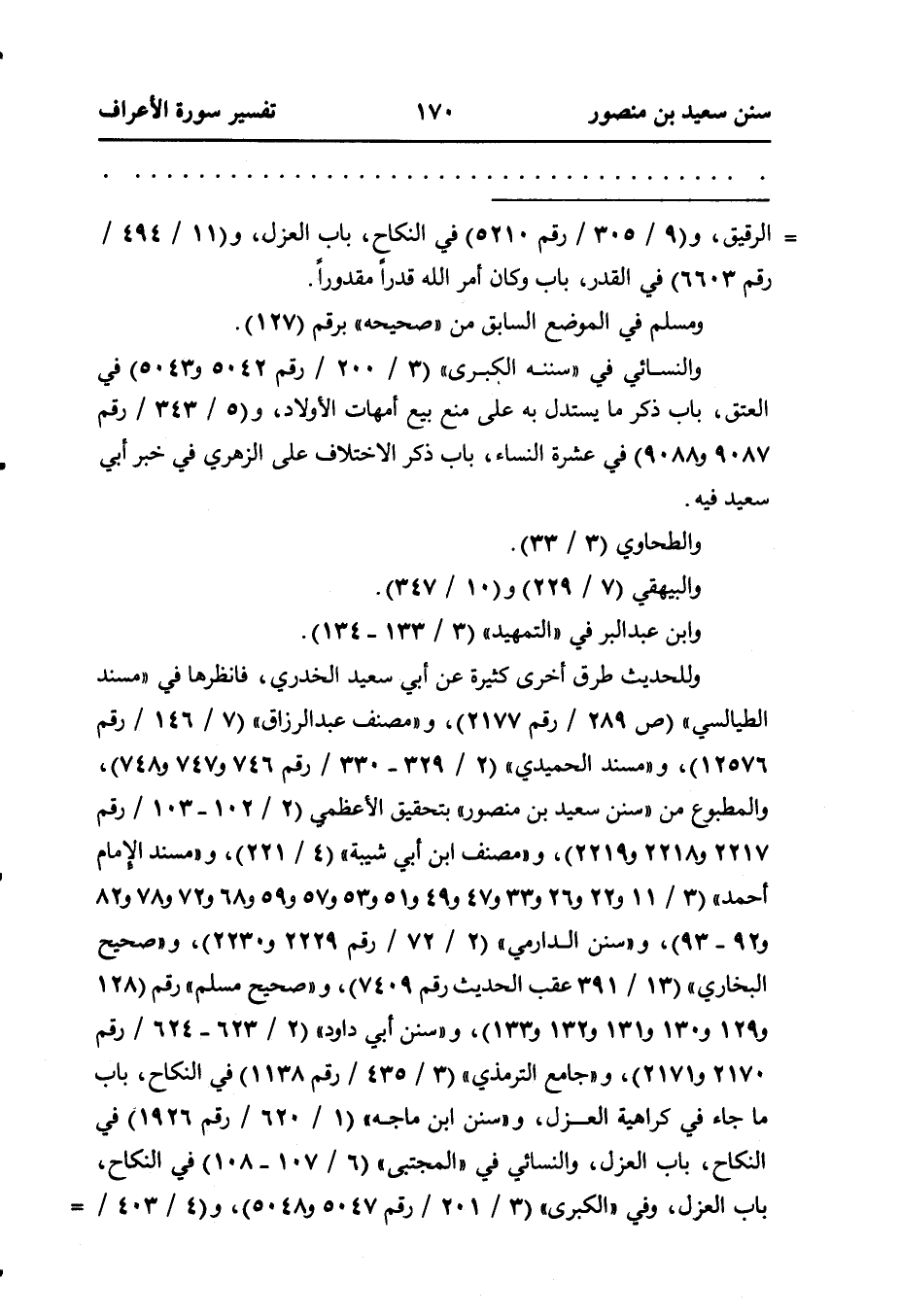 وللحديث طرق أخرى كثيرة عن أبي سعيد الخدري، فانظرها في "مسند الطيالسي" (ص٢٨٩ رقم ٢١٧٧) ، و"مصنف عبد الرزاق" (٧ / ١٤٦ رقم ١٢٥٧٦) ، و"مسند الحميدي" (٢ / ٣٢٩ - ٣٣٠ رقم ٧٤٦ و ٧٤٧ و ٧٤٨) ، والمطبوع من "سنن سعيد بن منصور" بتحقيق الأعظمي (٢ / ١٠٢ - ١٠٣ رقم ٢٢١٧ و ٢٢١٨ و ٢٢١٩) ، و"مصنف ابن أبي شيبة" (٤ / ٢٢١) ، و"مسند الإمام أحمد" (٣ / ١١ و ٢٢ و ٢٦ و ٣٣ و ٤٧ و ٤٩ و ٥١ و ٥٣ و ٥٧ و ٥٩ و ٦٨ و ٧٢ و ٧٨ و ٨٢ و ٩٢ - ٩٣) ، و"سنن الدارمي" (٢ / ٧٢ رقم ٢٢٢٩ و ٢٢٣٠) ، و"صحيح البخاري" (١٣ / ٣٩١ عقب الحديث رقم ٧٤٠٩) ، و"صحيح مسلم" رقم (١٢٨ و ١٢٩ و ١٣٠ و ١٣١ و ١٣٢ و ١٣٣) ، و"سنن أبي داود" (٢ / ٦٢٣ - ٦٢٤ رقم ٢١٧٠ و ٢١٧١) ، و"جامع الترمذي" (٣ / ٤٣٥ رقم ١١٣٨) في النكاح، باب ما جاء في كراهية العزل، و"سنن ابن ماجه" (١ / ٦٢٠ رقم ١٩٢٦) في النكاح، باب العزل، والنسائي في "المجتبى" (٦ / ١٠٧ - ١٠٨) في النكاح، باب العزل، وفي "الكبرى" (٣ / ٢٠١ رقم ٥٠٤٧ و ٥٠٤٨) ، و (٤ / ٤٠٣ =