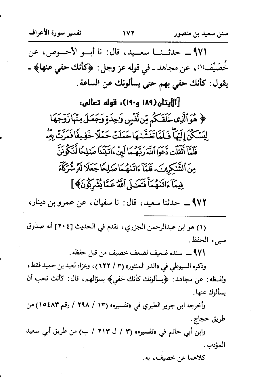 ٩٧١ - حَدَّثَنَا سَعِيدٌ، قَالَ: نا أَبُو الْأَحْوَصِ، عَنْ خُصَيْف (¬١)، عَنْ مُجَاهِدٍ - فِي قَوْلِهِ عَزَّ وَجَلَّ: {كَأَنَّكَ حَفِيٌّ عَنْهَا} - يَقُولُ: كَأَنَّكَ حَفِيٌّ بِهِمْ حَتَّى يَسْأَلُونَكَ عَنِ السَّاعَةِ.