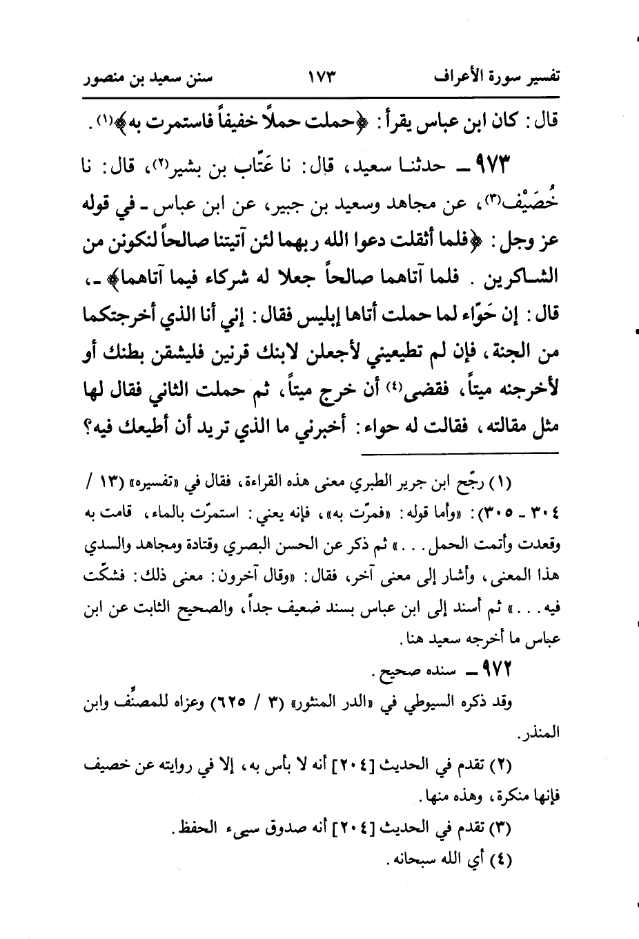 ٩٧٣ - حَدَّثَنَا سَعِيدٌ، قَالَ: نا عَتّاب بْنُ بَشِيرٍ (¬٢)، قَالَ: نا خُصَيْف (¬٣)، عَنْ مُجَاهِدٍ، وَسَعِيدُ بْنُ جُبَيْرٍ، عَنِ ابْنِ عَبَّاسٍ - فِي قَوْلِهِ عَزَّ وَجَلَّ: {فَلَمَّا أَثْقَلَتْ دَعَوَا اللهَ رَبَّهُمَا لَئِنْ آتَيْتَنَا صَالِحًا لَنَكُونَنَّ مِنَ الشَّاكِرِينَ. فَلَمَّا آتَاهُمَا صَالِحًا جَعَلَا لَهُ شُرَكَاءَ فِيمَا آتَاهُمَا} -، قَالَ: إِنَّ حَوّاء لَمَّا حَمَلَتْ أَتَاهَا إِبْلِيسُ فَقَالَ: إِنِّي أَنَا الَّذِي أَخْرَجْتُكُمَا مِنَ الْجَنَّةِ، فَإِنْ لَمْ تُطِيعِينِي لَأَجْعَلَنَّ لِابْنِكِ قَرْنَيْنِ فَلَيَشُقَّنَّ بَطْنَكِ أَوْ لَأُخْرِجَنَّهُ مَيِّتًا، فَقَضَى (¬٤) أَنْ خَرَجَ مَيِّتًا، ثُمَّ حَمَلَتِ الثَّانِيَ فَقَالَ لَهَا مِثْلَ مَقَالَتِهِ، فَقَالَتْ لَهُ حَوَّاءُ: أَخْبِرْنِي مَا الَّذِي تُرِيدُ أَنْ أُطِيعَكَ فيه؟