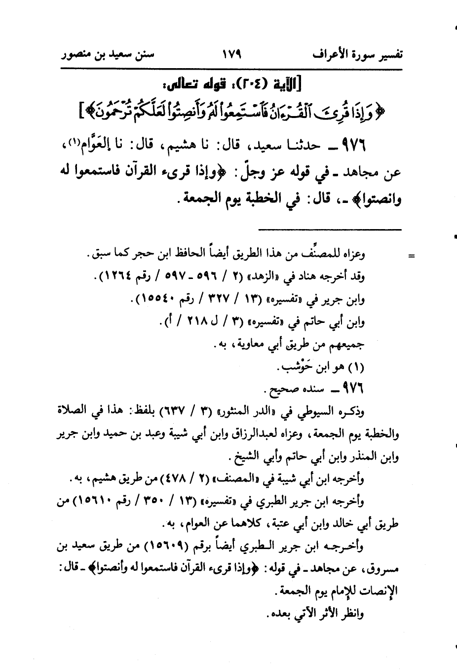 ٩٧٦ - حَدَّثَنَا سَعِيدٌ، قَالَ: نا هُشَيْمٌ، قَالَ: نَا العَوَّام (¬١)، عَنْ مُجَاهِدٍ - فِي قَوْلِهِ عَزَّ وَجَلَّ: {وَإِذَا قُرِئَ القُرْآنُ فَاسْتَمِعُوا لَهُ وَأَنْصِتُوا} - قَالَ: فِي الْخُطْبَةِ يَوْمَ الْجُمُعَةِ.