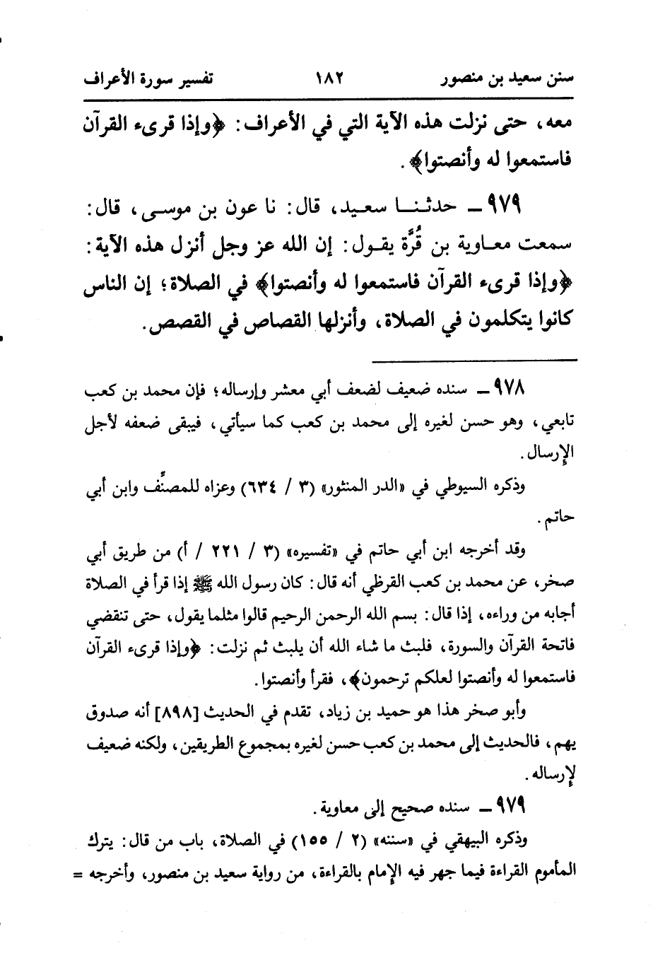 ٩٧٩- حَدَّثَنَا سَعِيدٌ، قَالَ: نا عَوْنُ بْنُ مُوسَى، قَالَ: سَمِعْتُ مُعَاوِيَةَ بْنَ قُرَّة، يَقُولُ: إِنَّ اللَّهَ عَزَّ وَجَلَّ أَنْزَلَ هَذِهِ الْآيَةَ: {وَإِذَا قُرِئَ القُرْآنُ فَاسْتَمِعُوا لَهُ وَأَنْصِتُوا} فِي الصَّلَاةِ؛ إِنَّ النَّاسَ كَانُوا يَتَكَلَّمُونَ فِي الصَّلَاةِ، وَأَنْزَلَهَا الْقَصَّاصُ في القصص.