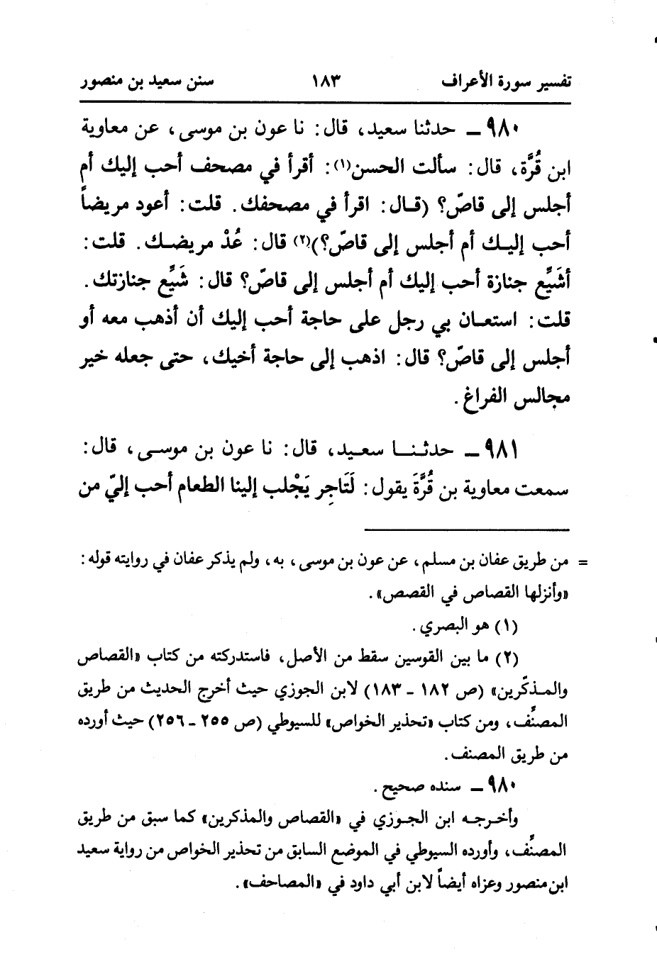 ٩٨٠ - حَدَّثَنَا سَعِيدٌ، قَالَ: نا عَوْنُ بْنُ مُوسَى، عَنْ مُعَاوِيَةَ بْنِ قُرَّة، قَالَ: سَأَلْتُ الْحَسَنَ (¬١)، أَقْرَأُ فِي مُصْحَفٍ أَحَبُّ إِلَيْكَ أَمْ أَجْلِسُ إِلَى قَاصٍّ؟ (قَالَ: اقْرَأْ فِي مُصْحَفِكَ، قُلْتُ: أَعُودُ مَرِيضًا أَحَبُّ إِلَيْكَ أَمْ أَجْلِسُ إِلَى قَاصٍّ؟) (¬٢) قَالَ: عُدْ مَرِيضَكَ. قُلْتُ: أشَيِّع جَنَازَةً أَحَبُّ إِلَيْكَ أَمْ أَجْلِسُ إِلَى قَاصٍّ؟ قَالَ: شَيِّع جَنَازَتَكَ. قُلْتُ: اسْتَعَانَ بِي رَجُلٌ عَلَى حَاجَةٍ أَحَبُّ إِلَيْكَ أَنْ أَذْهَبَ مَعَهُ أَوْ أَجْلِسُ إِلَى قَاصٍّ؟ قَالَ: اذْهَبْ إِلَى حَاجَةِ أَخِيكَ، حَتَّى جَعَلَهُ خَيْرَ مَجَالِسِ الْفَرَاغِ.