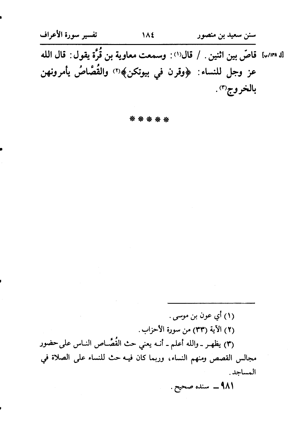 قاصّ بين اثنين. [ل ١٣٨/ب] قَالَ (¬١): وَسَمِعْتُ مُعَاوِيَةَ بْنَ قُرَّة يَقُولُ: قَالَ اللَّهُ عَزَّ وَجَلَّ للنساء {وَقَرْنَ فِي بُيُوتِكُنَّ} (¬٢) والقُصَّاصُ يأمرونهن بالخروج (¬٣).