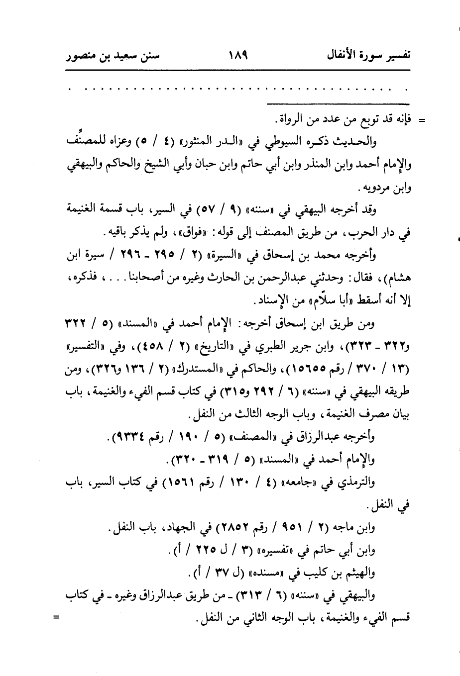 ومن طريق ابن إسحاق أخرجه: الإمام أحمد في «المسند» (٥ / ٣٢٢ - ٣٢٣) ، وابن جرير الطبري في «التاريخ» (٢ / ٤٥٨) ، وفي «التفسير» (١٣ / ٣٧٠ / رقم ١٥٦٥٥) ، والحاكم في «المستدرك» (٢ / ١٣٦ و ٣٢٦) ، ومن طريقه البيهقي في «سننه» (٦ / ٢٩٢ و ٣١٥) في كتاب قسم الفيء والغنيمة، باب بيان مصرف الغنيمة، وباب الوجه الثالث من النفل.