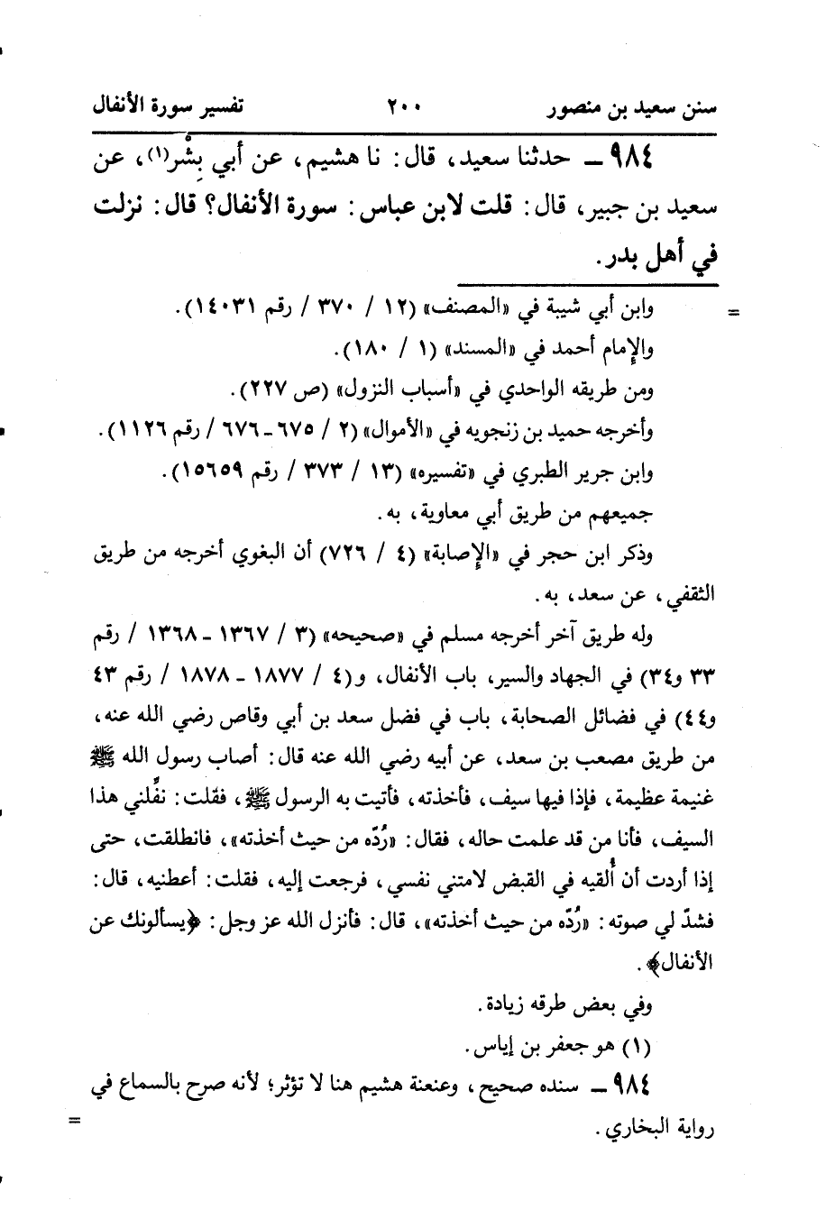 ٩٨٤ - حَدَّثَنَا سَعِيدٌ، قَالَ: نا هُشَيْمٌ، عَنْ أَبِي بِشْر (¬١)، عَنْ سَعِيدِ بْنِ جُبَيْرٍ، قَالَ: قُلْتُ لِابْنِ عَبَّاسٍ: سُورَةُ الْأَنْفَالِ؟ قَالَ: نَزَلَتْ في أهل بدر.