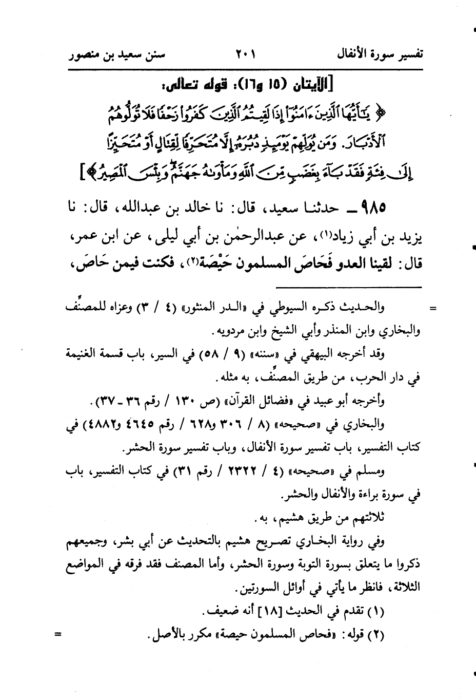 ٩٨٥ - حَدَّثَنَا سَعِيدٌ، قَالَ: نا خَالِدُ بْنُ عَبْدِ اللَّهِ، قَالَ: نا يَزِيدَ بْنِ أَبِي زِيَادٍ (¬١)، عَنْ عَبْدِ الرَّحْمَنِ بْنِ أَبِي لَيْلَى، عَنِ ابْنِ عُمَرَ، قَالَ: لَقِينَا الْعَدُوَّ فَحَاصَ الْمُسْلِمُونَ حَيْصَة (¬٢)، فَكُنْتُ فيمن حَاصَ،