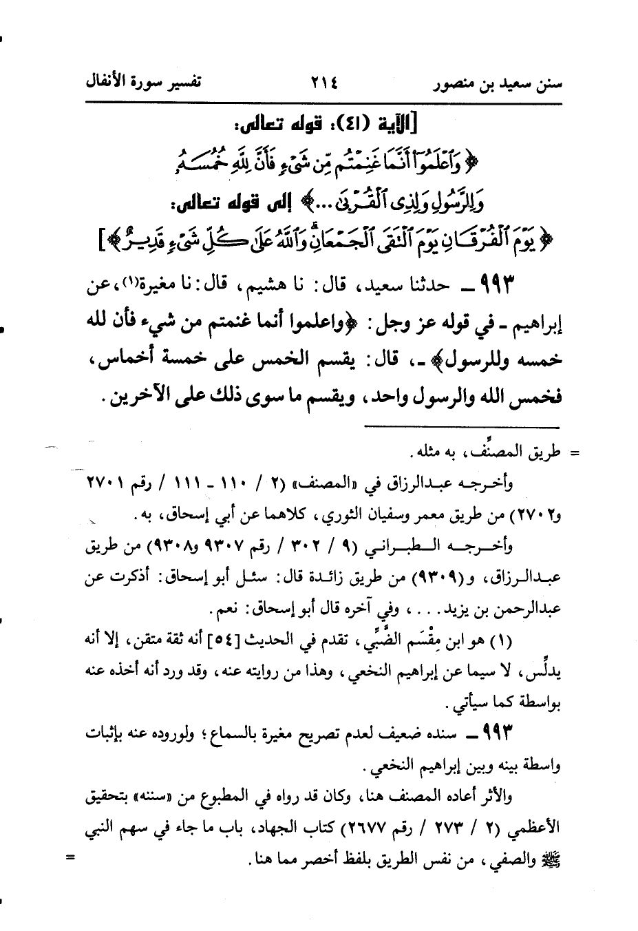 ٩٩٣ - حَدَّثَنَا سَعِيدٌ، قَالَ: نا هُشَيْمٌ، قَالَ: نا مُغِيرَةُ (¬١)، عَنْ إِبْرَاهِيمَ - فِي قَوْلِهِ عَزَّ وَجَلَّ: {وَاعْلَمُوا أَنَّمَا غَنِمْتُمْ مِنْ شَيْءٍ فَأَنَّ للهِ خُمُسَهُ وَلِلرَّسُولِ} -، قَالَ: يُقْسَّمُ الْخُمُسُ عَلَى خَمْسَةِ أَخْمَاسٍ، فَخُمُسُ اللَّهِ وَالرَّسُولِ وَاحِدٌ، وَيُقْسَّمُ مَا سِوَى ذَلِكَ عَلَى الآخرين.
