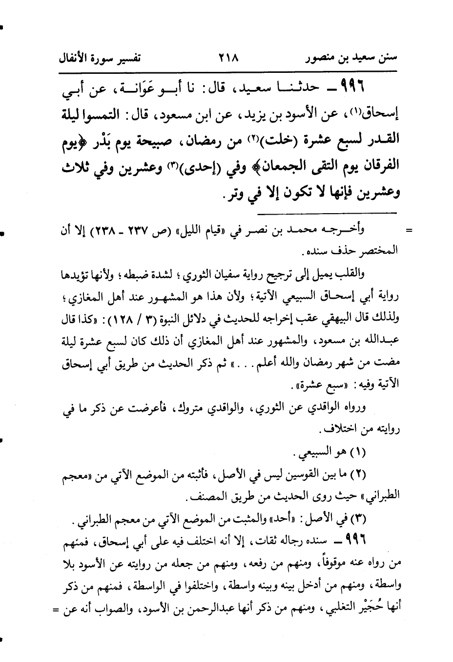 ٩٩٦ - حَدَّثَنَا سَعِيدٌ، قَالَ: نا أَبُو عَوَانة، عَنْ أَبِي إِسْحَاقَ (¬١)، عَنْ الْأَسْوَدِ بْنِ يَزِيدَ، عَنِ ابْنِ مَسْعُودٍ، قَالَ: الْتَمِسُوا لَيْلَةَ الْقَدْرِ لِسَبْعَ عَشْرَةَ (خَلَتْ) (¬٢) مِنْ رَمَضَانَ، صَبِيحَةَ يَوْمِ بَدْر: {يَوْمَ الفُرْقَانِ يَوْمَ التَقَى الجَمْعَانِ} وَفِي (إِحْدَى) (¬٣) وَعِشْرِينَ وَفِي ثَلَاثٍ وَعِشْرِينَ فَإِنَّهَا لَا تَكُونُ إِلَّا في وتر.