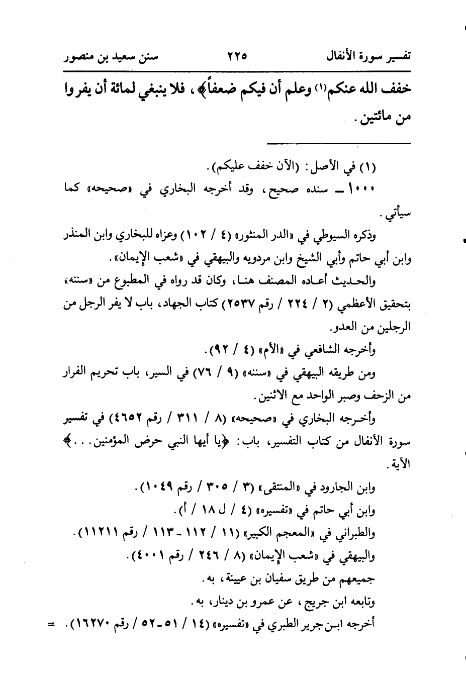 خَفَّفَ اللهُ عَنْكُمْ (¬١) وَعَلِمَ أَنَّ فِيكُمْ ضَعْفًا}، فَلَا يَنْبَغِي لِمِائَةٍ أَنْ يَفِرُّوا من مائتين.