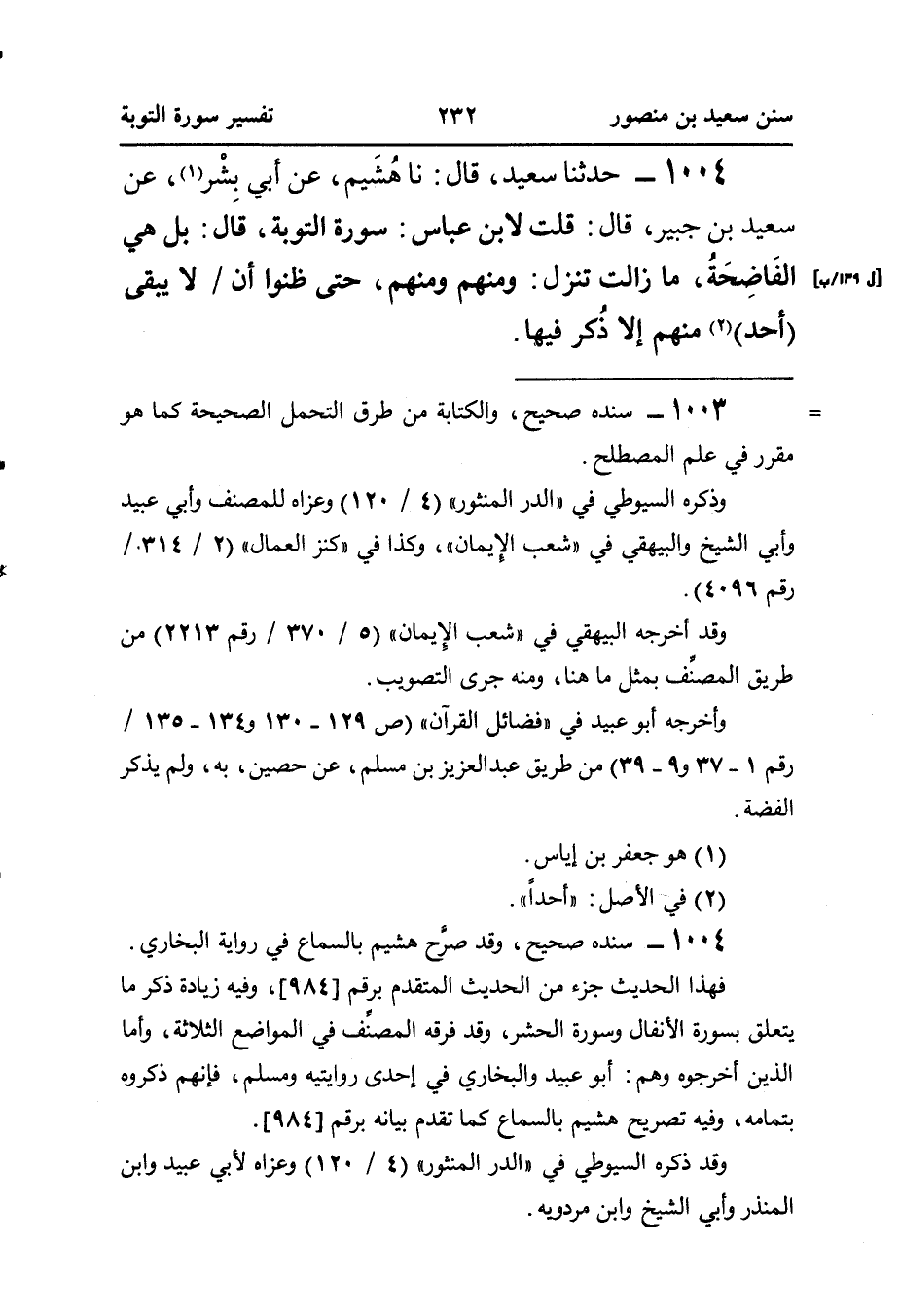 ١٠٠٤ - حَدَّثَنَا سَعِيدٌ، قَالَ: نا هُشَيم، عَنْ أَبِي بِشْر (¬١)، عَنْ سَعِيدِ بْنِ جُبَيْرٍ، قَالَ: قُلْتُ لِابْنِ عَبَّاسٍ: سُورَةُ التَّوْبَةِ، قَالَ: بَلْ هِيَ الفَاضِحَةُ، مَا زَالَتْ تَنْزِلُ: وَمِنْهُمْ، وَمِنْهُمْ، حَتَّى ظَنُّوا أَنْ [ل ١٣٩/ب] لَا يَبْقَى (أَحَدٌ) (¬٢) مِنْهُمْ إِلَّا ذُكر فيها.