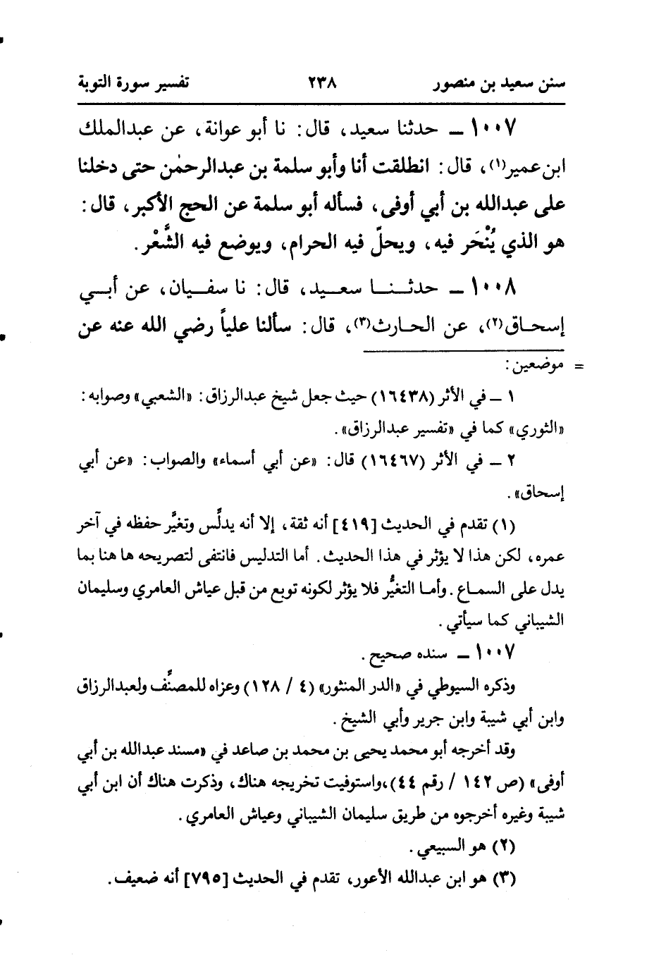١٠٠٧ - حَدَّثَنَا سَعِيدٌ، قَالَ: نا أَبُو عَوَانَةَ، عَنْ عَبْدِ الْمَلِكِ بْنِ عُمَيْرٍ (¬١)، قَالَ: انْطَلَقْتُ أَنَا وَأَبُو سَلَمَةَ بْنُ عَبْدِ الرَّحْمَنِ حَتَّى دَخَلْنَا عَلَى عَبْدِ اللَّهِ بْنِ أَبِي أَوْفَى، فَسَأَلَهُ أَبُو سَلَمَةَ عَنِ الْحَجِّ الْأَكْبَرِ، قَالَ: هُوَ الَّذِي يُنْحَر فِيهِ، وَيَحِلُّ فِيهِ الْحَرَامُ، وَيُوضَعُ فِيهِ الشَّعْر.