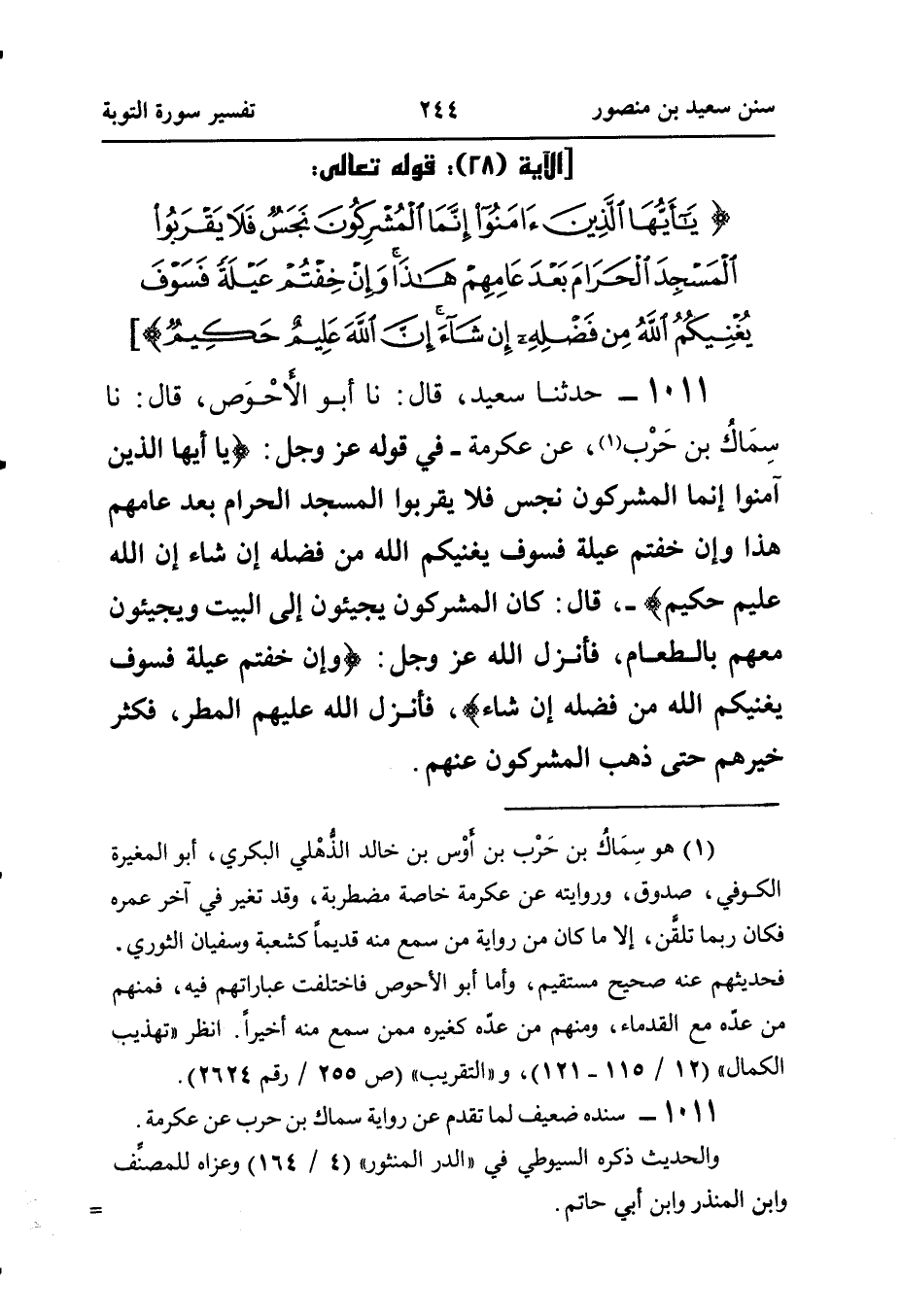 ١٠١١ - حَدَّثَنَا سَعِيدٌ، قَالَ: نا أَبُو الأَحْوَص، قَالَ: نَا سِمَاكُ بْنُ حَرْب (¬١)، عَنْ عِكْرِمَةَ - فِي قَوْلِهِ عَزَّ وَجَلَّ: {يَا أَيُّهَا الَّذِينَ آمَنُوا إِنَّمَا المُشْرِكُونَ نَجَسٌ فَلَا يَقْرَبُوا المَسْجِدَ الحَرَامَ بَعْدَ عَامِهِمْ هَذَا وَإِنْ خِفْتُمْ عَيْلَةً فَسَوْفَ يُغْنِيكُمُ اللهُ مِنْ فَضْلِهِ إِنْ شَاءَ إِنَّ اللهَ عَلِيمٌ حَكِيمٌ} -، قَالَ: كَانَ الْمُشْرِكُونَ يَجِيئُونَ إِلَى الْبَيْتِ وَيَجِيئُونَ مَعَهُمْ بِالطَّعَامِ، فَأَنْزَلَ اللَّهُ عَزَّ وَجَلَّ {وَإِنْ خِفْتُمْ عَيْلَةً فَسَوْفَ يُغْنِيكُمُ اللهُ مِنْ فَضْلِهِ إِنْ شَاءَ}، فَأَنْزَلَ اللَّهُ عَلَيْهِمُ الْمَطَرَ، فَكَثُرَ خَيْرُهُمْ حَتَّى ذَهَبَ الْمُشْرِكُونَ عَنْهُمْ.