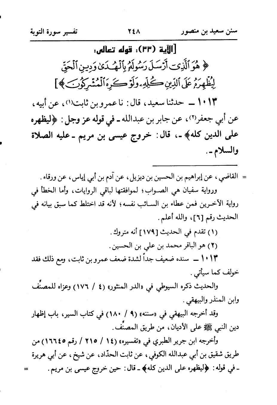 ١٠١٣ - حَدَّثَنَا سَعِيدٌ، قَالَ: نا عَمْرُو بْنُ ثَابِتٍ (¬١)، عَنْ أَبِيهِ، عَنْ أَبِي جَعْفَرٍ (¬٢)، عَنْ جَابِرِ بْنِ عَبْدِ اللَّهِ - فِي قَوْلِهِ عَزَّ وَجَلَّ: {لِيُظْهِرَهُ عَلَى الدِّينِ كُلِّهِ} - قَالَ: خُرُوجُ عِيسَى ابْنِ مَرْيَمَ عليه الصلاة والسلام.